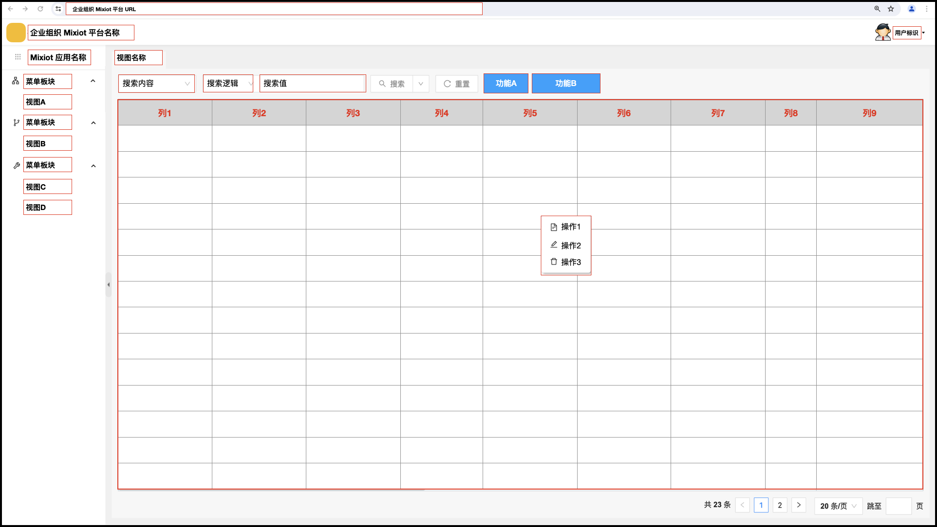 “视图功能” 是当前视图(或视图列表)对应的功能。比如,添加、导出,等等。