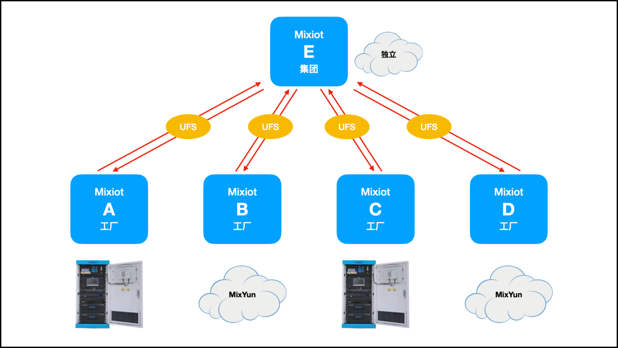 这 5个 Mixiot 平台都是独立部署的,也就是说,这个集团有 5套独立运行的 Mixiot 系统。虽然它们都是独立运行,集团下属工厂的 Mixiot 系统,都可以用 UFS 机制,把集团总部需要的数据,从工厂的 Mixiot 系统上报给集团的 Mixiot 系统。