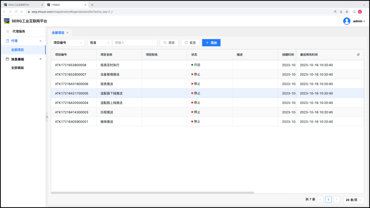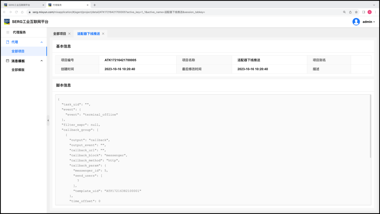 比如我们创建了一个 “适配器下线推送” 的代理项目,意思是当某个或某些制定的数据终端(适配器)离线的时候,便委托 “代理服务” 应用推送一个消息。