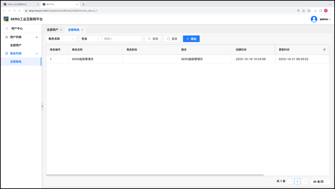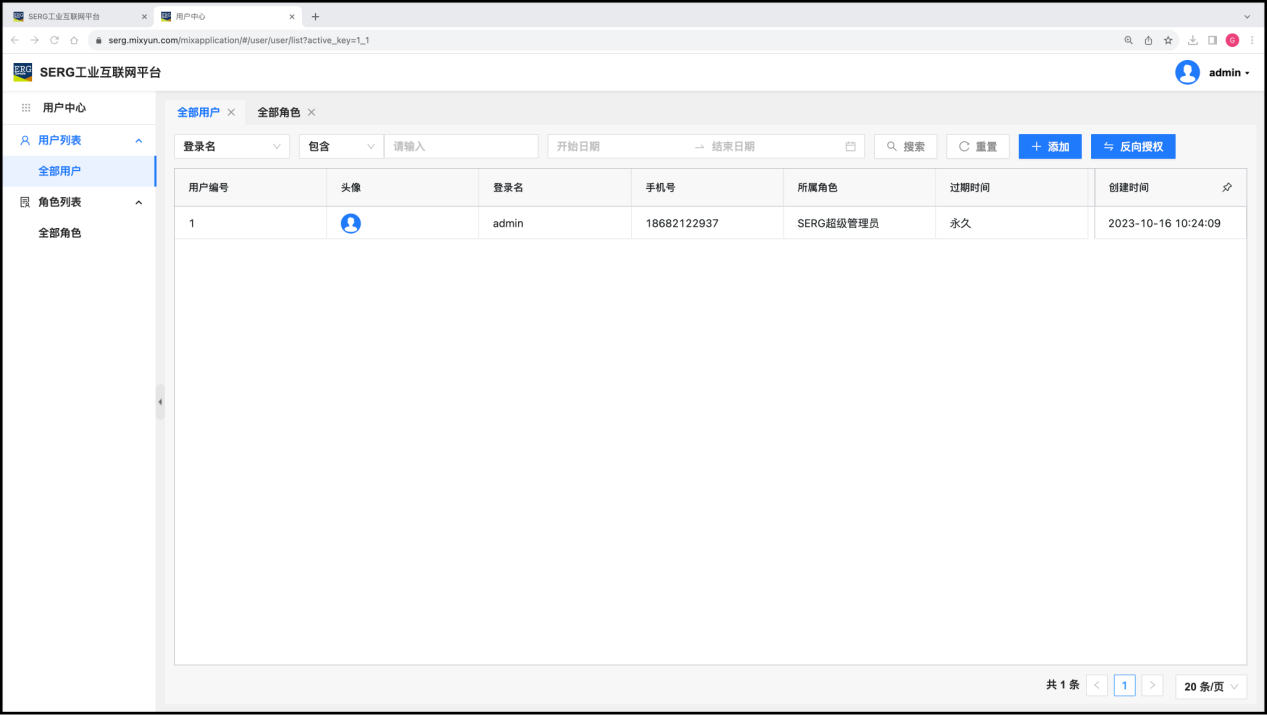 完成工业互联网平台的设置后,超级管理员(admin)还需要使用 “用户中心” 这个应用,为自己这个平台创建用户角色,还要为每一个具体使用者创建对应的用户账号,以及为用户的使用完成一系列的授权。