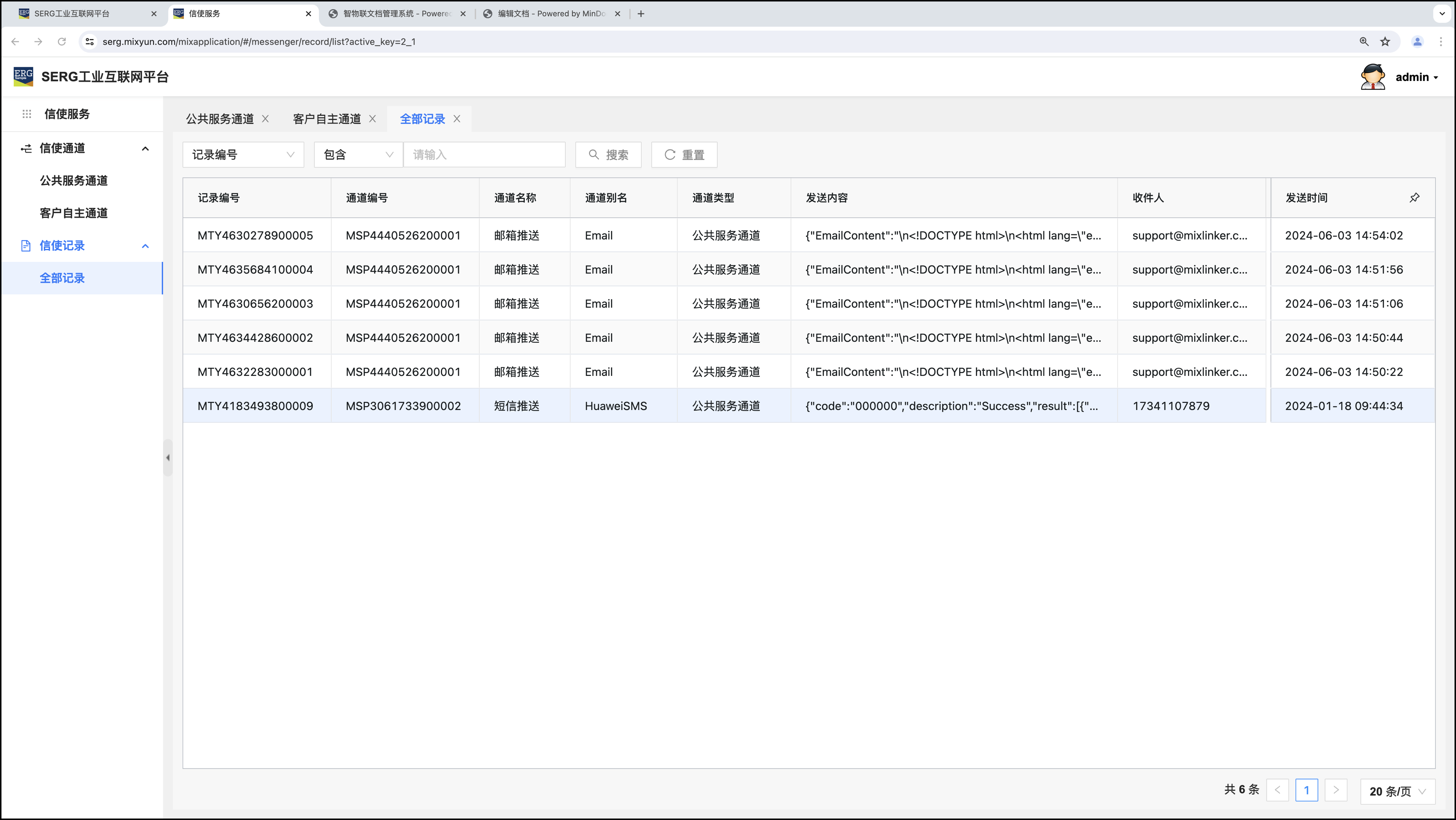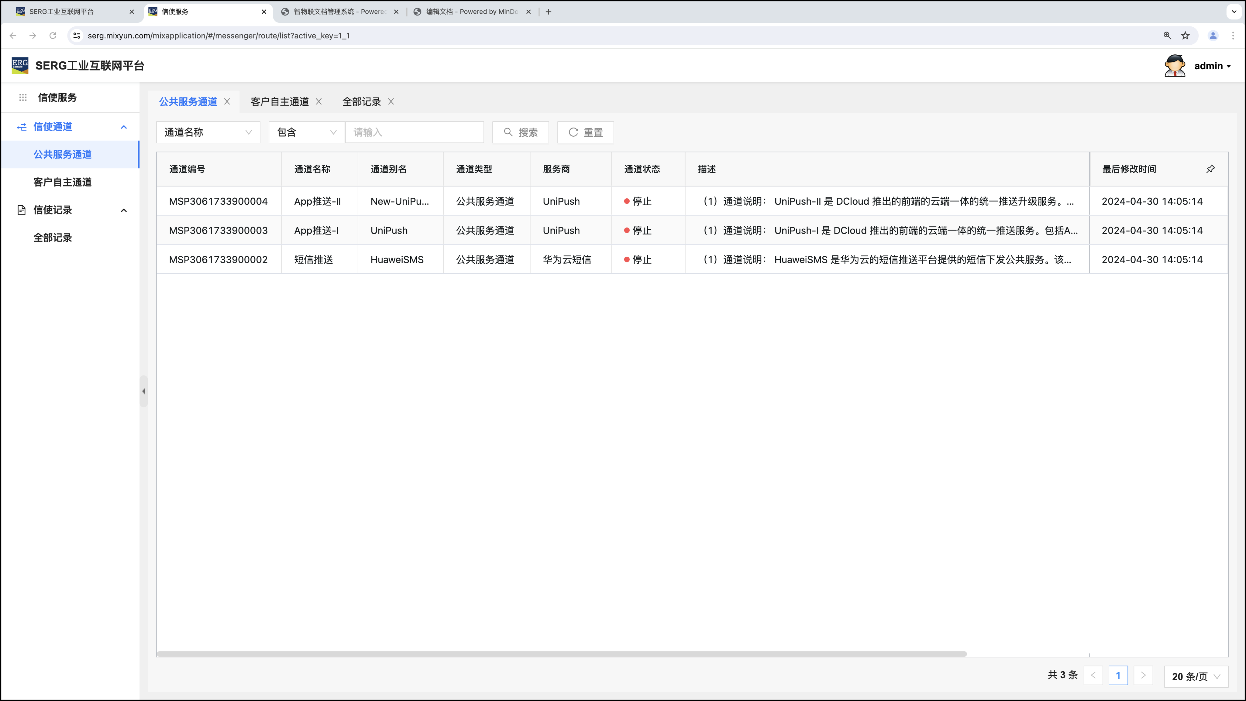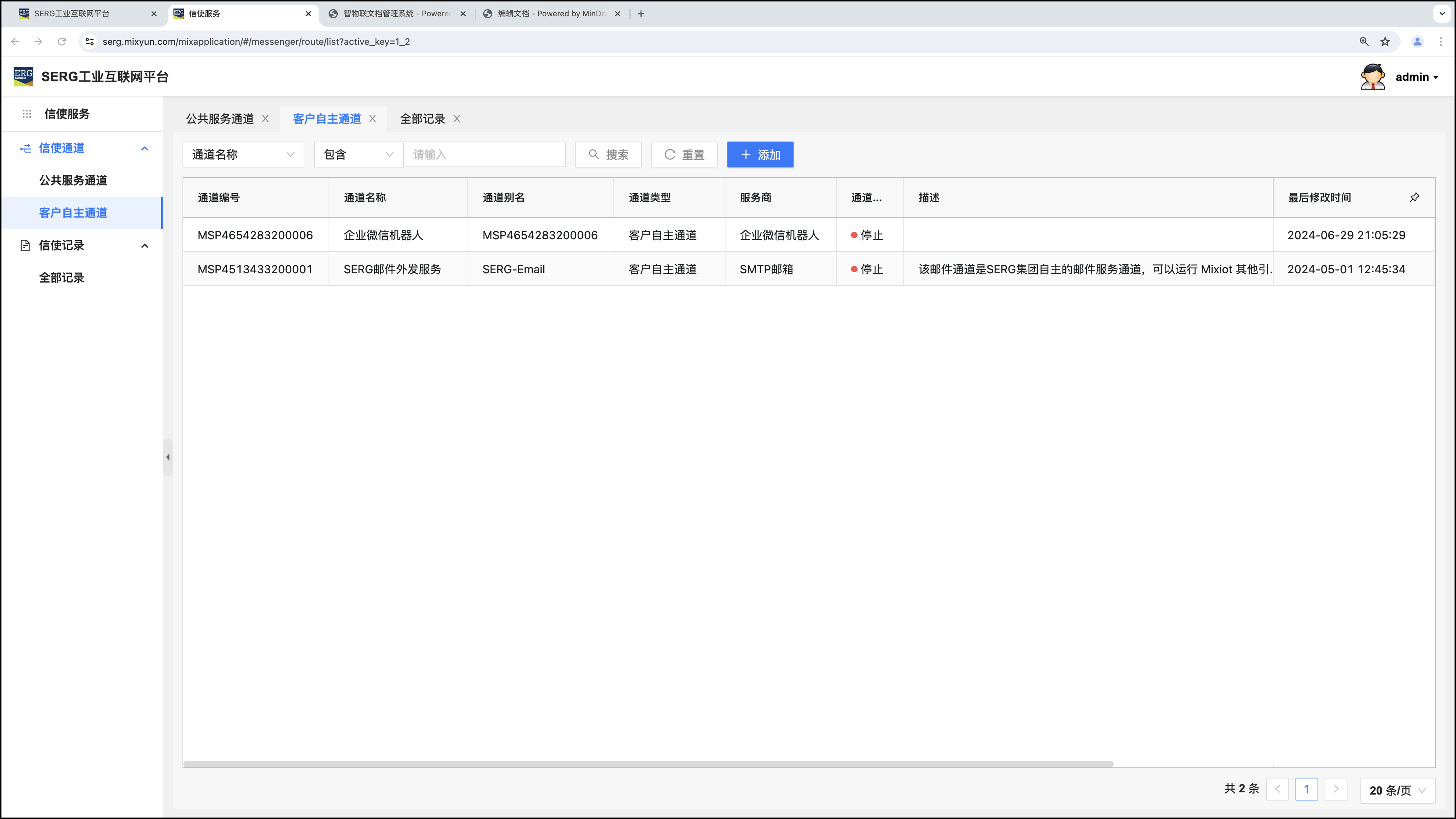 “信使服务” 应用是MixIOT体系中,对系统外发送信息或消息的应用。“信使服务” 由两个部分构成,一个是“通道”,另一个是服务通道对应的 “服务项目”。