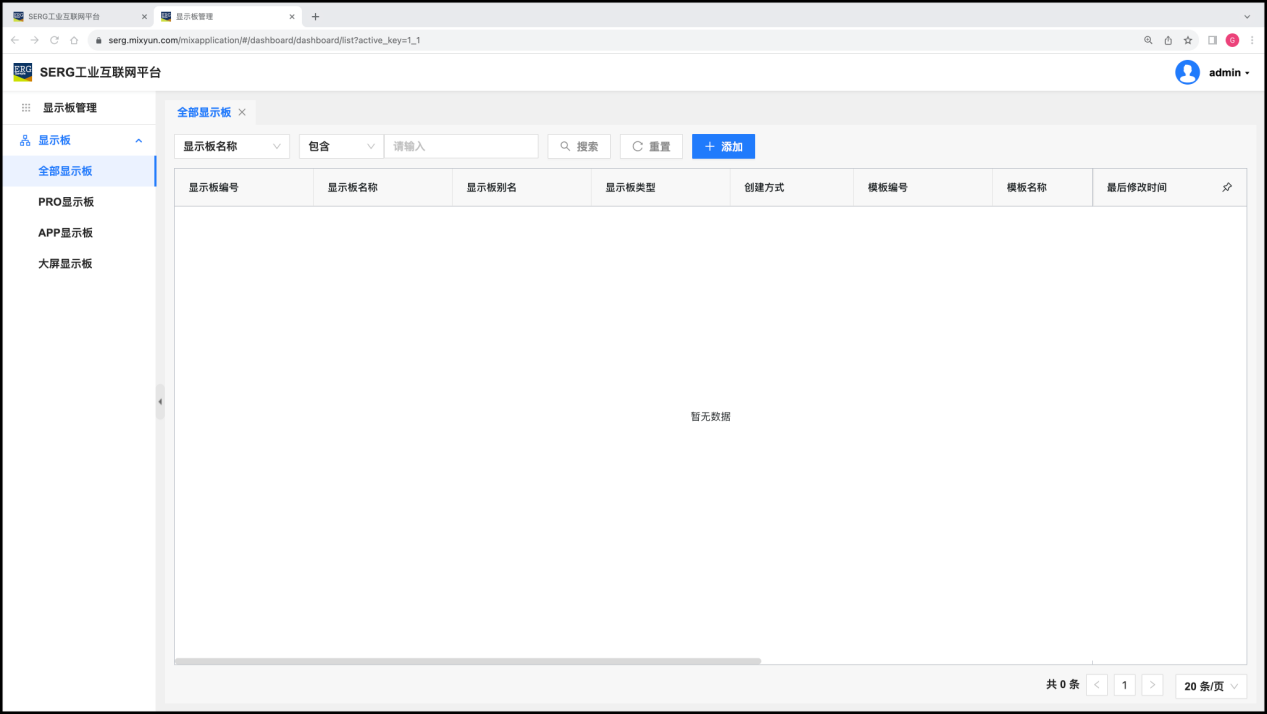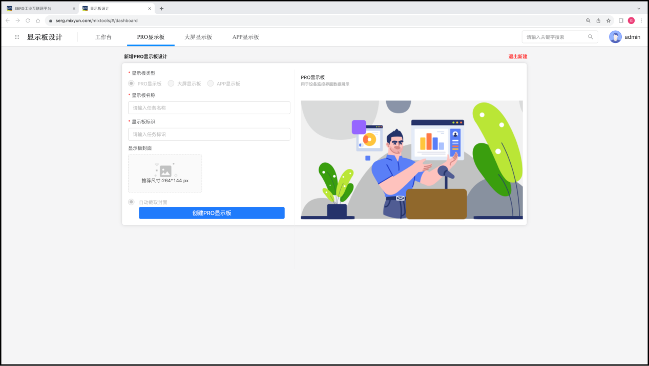 “显示板设计” 应用是 MixIOT 体系中一个可视化数据的设计工具,可以设计三种类型的显示板:Pro 显示板、大屏显示板和 App 显示板。