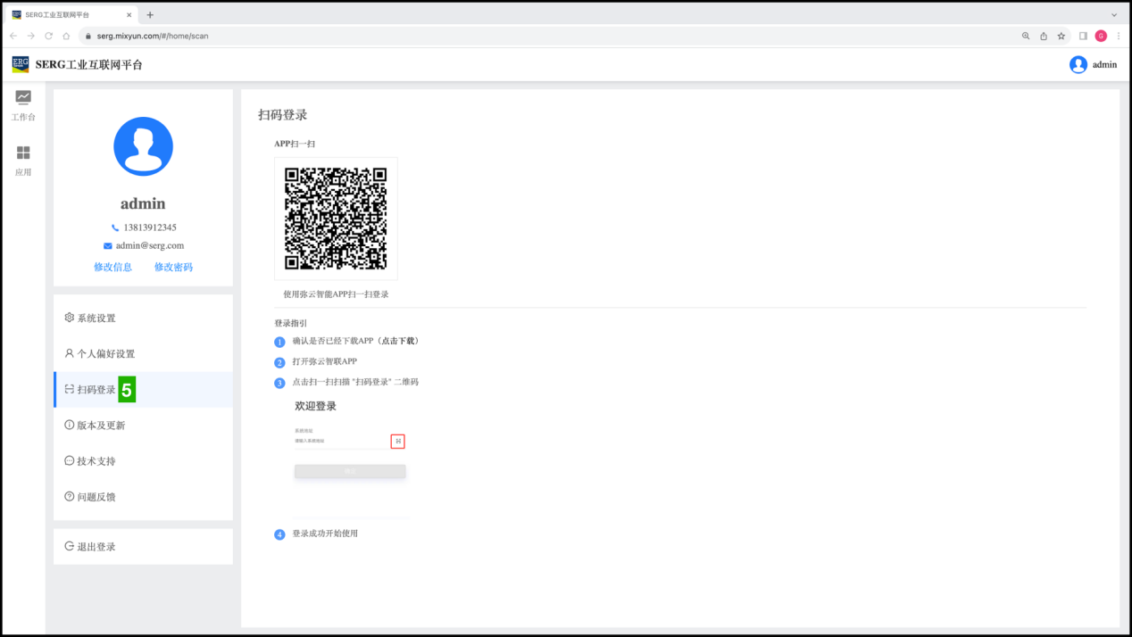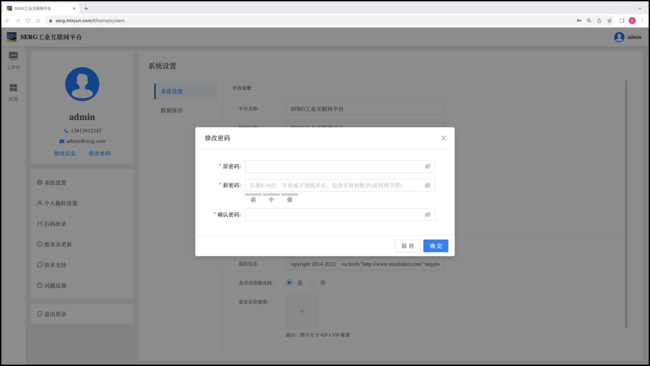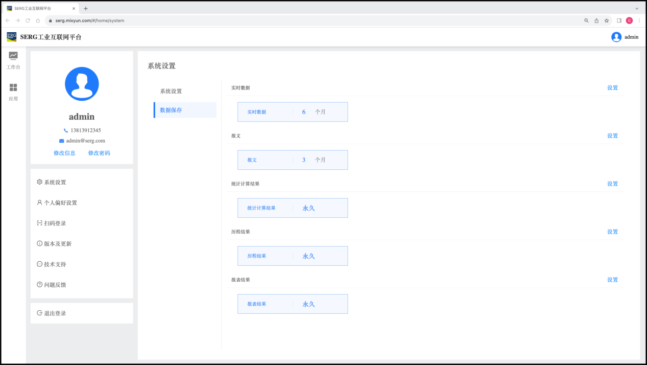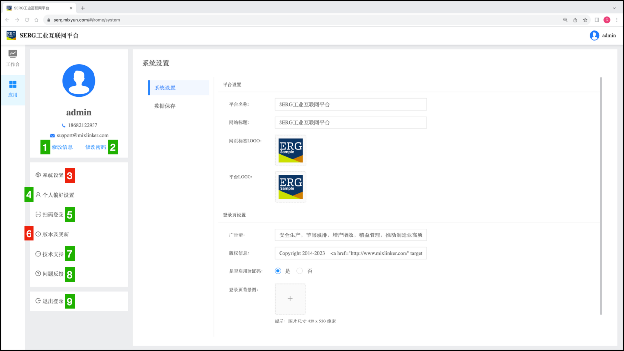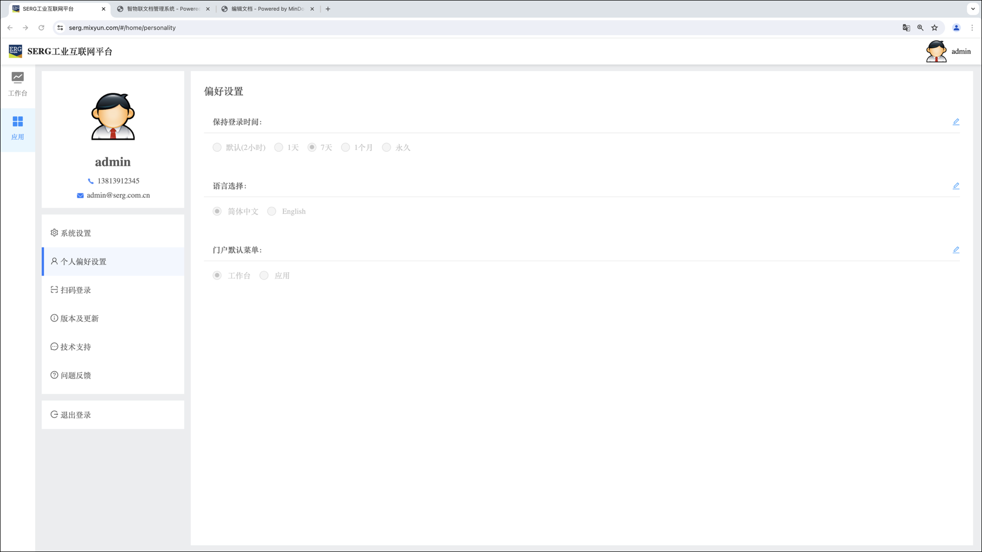 超级管理员(Admin)和普通用户在登录后,都可以对本账户进行设置和使用。我们以 SERG组织用户进行说明。