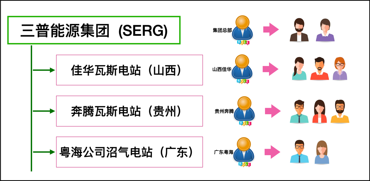 以四个不同所属单位作为角色(集团总部、山西佳华、贵州奔腾和广东粤海),这样一来,不同的单位的就都归属到同一个角色: