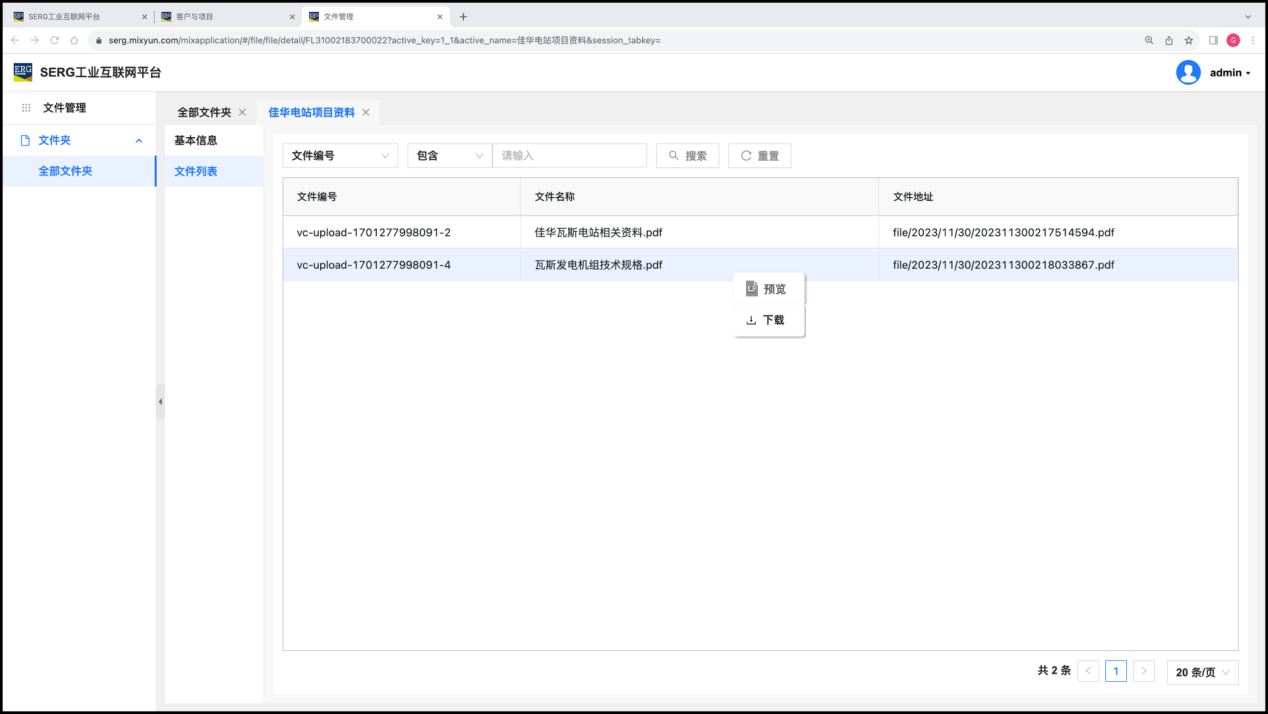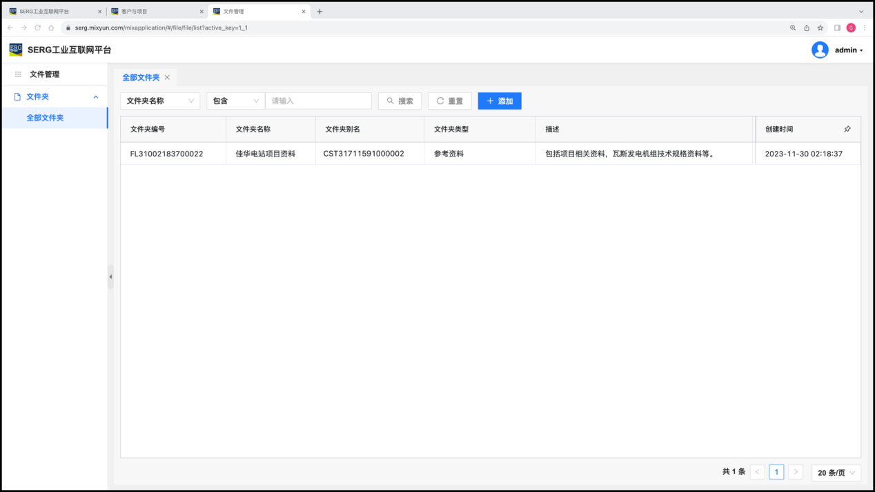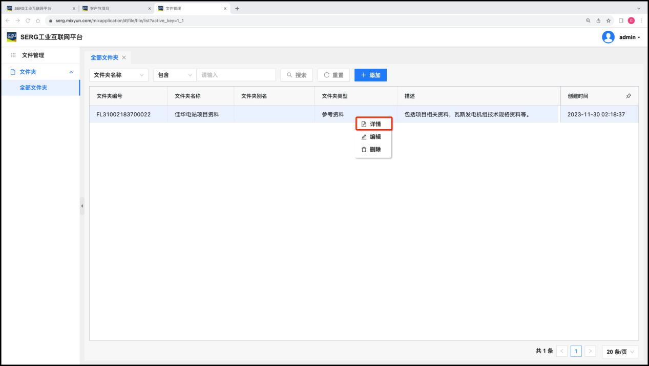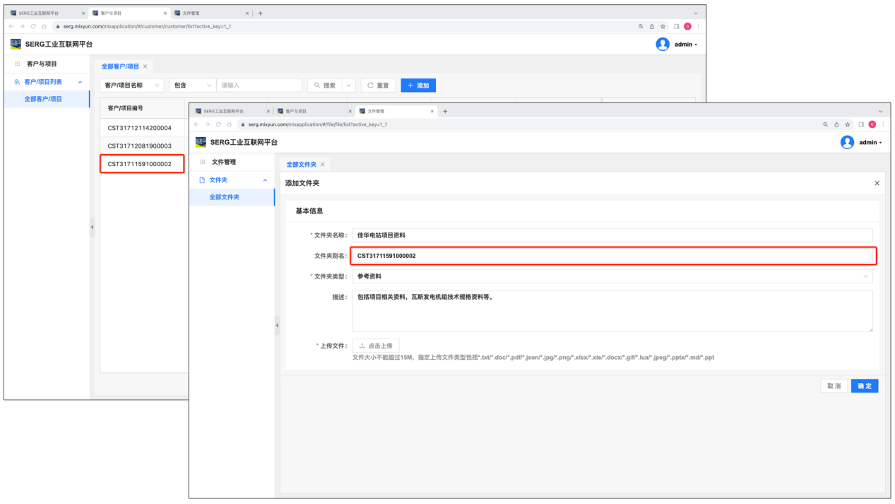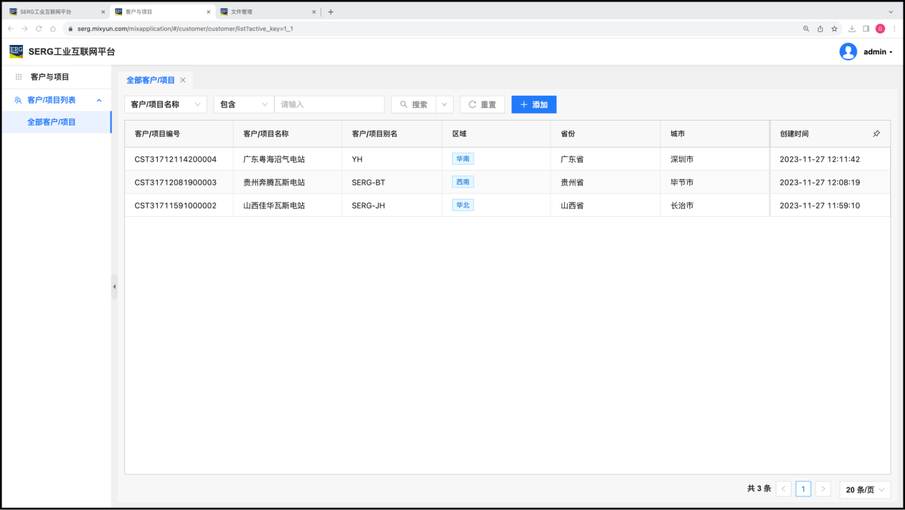 我们在 “客户与项目” 应用中,为SERG工业互联网工程落地实施设定了两个项目和一个客户:山西佳华瓦斯电站、贵州奔腾瓦斯电站,和 广东粤海沼气电站。