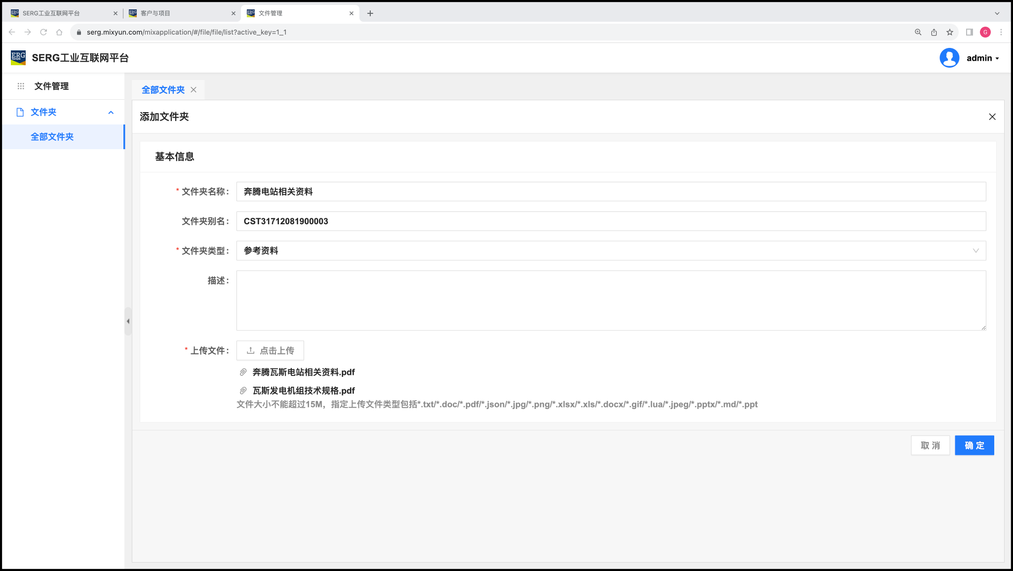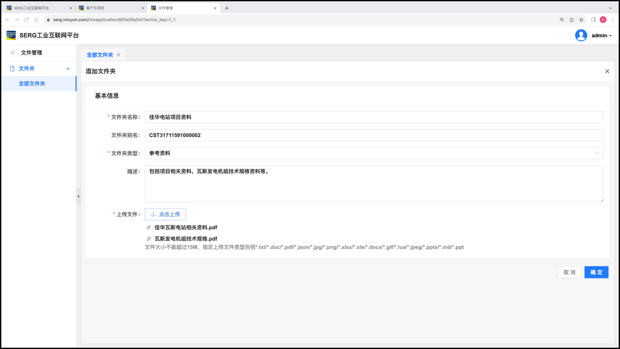 同样,分别为 “贵州奔腾瓦斯电站” 项目和 “广东粤海沼气电站” 客户创建文件夹,把相关文件上传到文件夹。