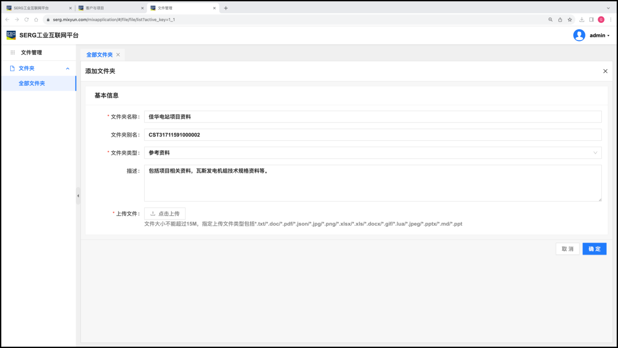 输入这个文件夹的名称 “佳华电站项目资料”,意思是这个文件夹的资料,主要是跟 “佳华电站” 有关的。需要注意的是,文件夹属性中的 “文件夹别名”用了 “CST31711591000002”,这是 “山西佳华瓦斯电站项目”的编号(标识)。