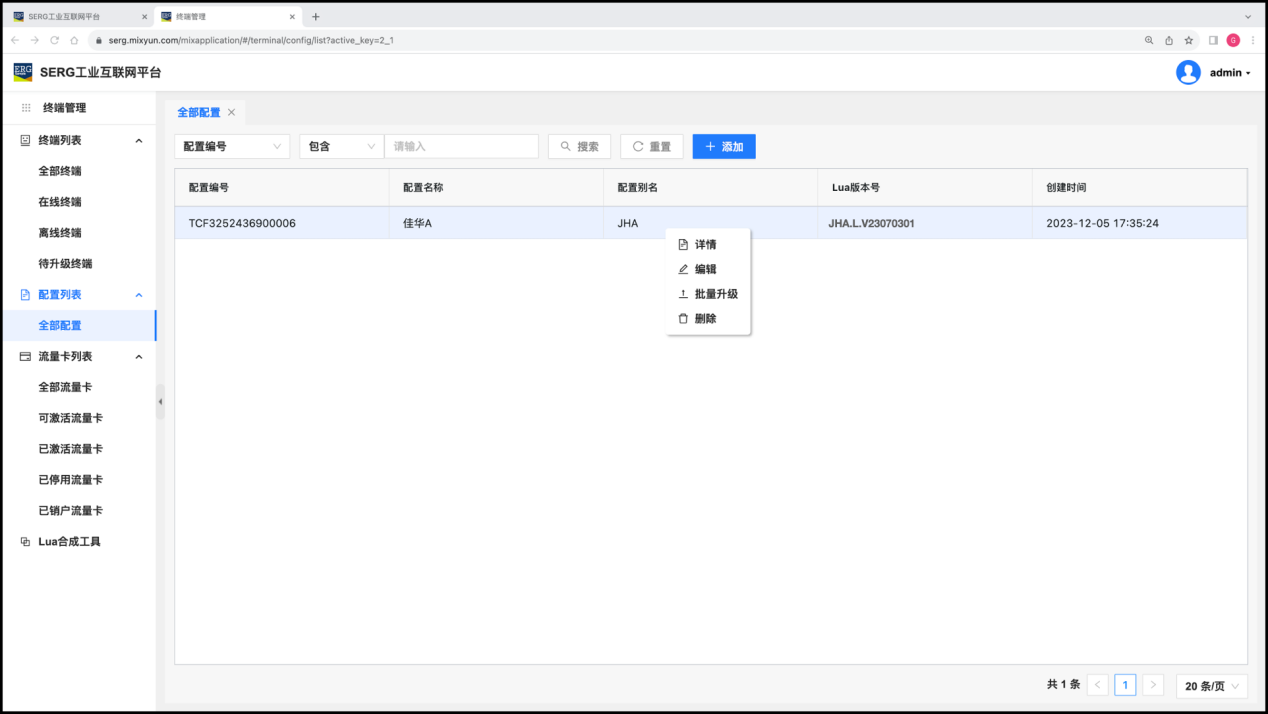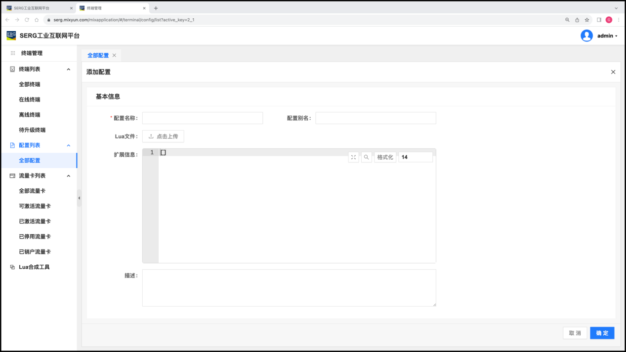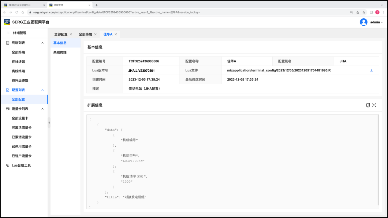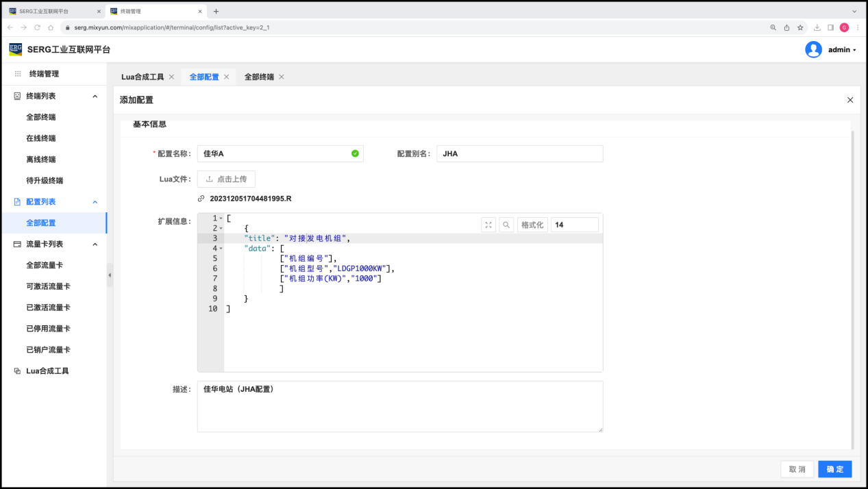 在 MixIOT 体系中,“数据终端” 有一个很重要的概念,就是数据终端的 “配置”。数据终端 “配置” 主要是指数据终端里面运行的数据交互程序以及程序版本。如果我们用的数据终端是 Aprus 适配器,那么,数据终端的配置指的就是数据终端里面运行的 Lua 程序(脚本)。