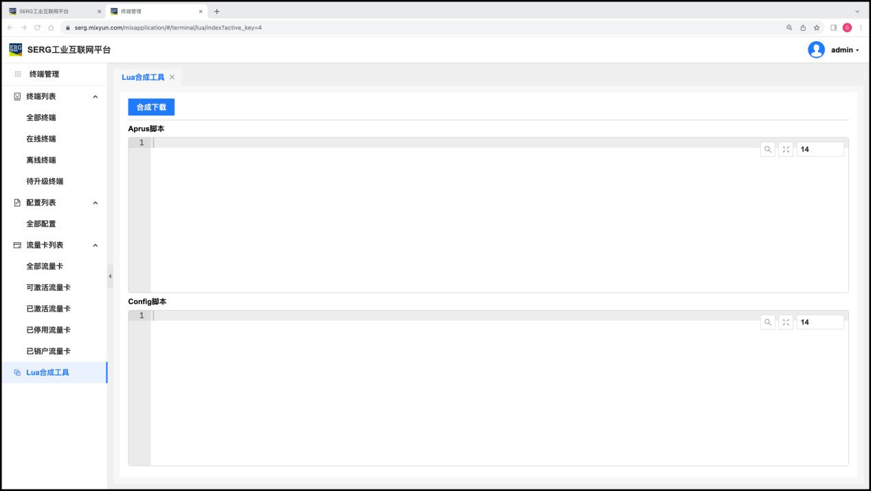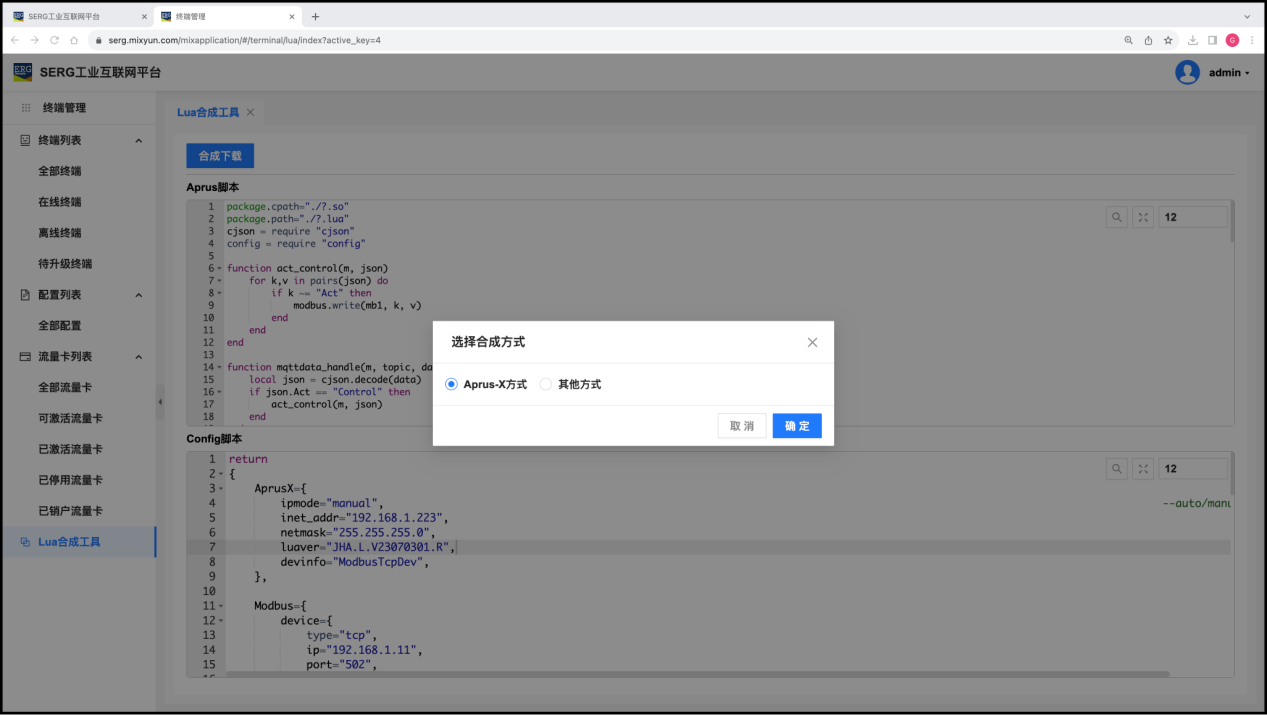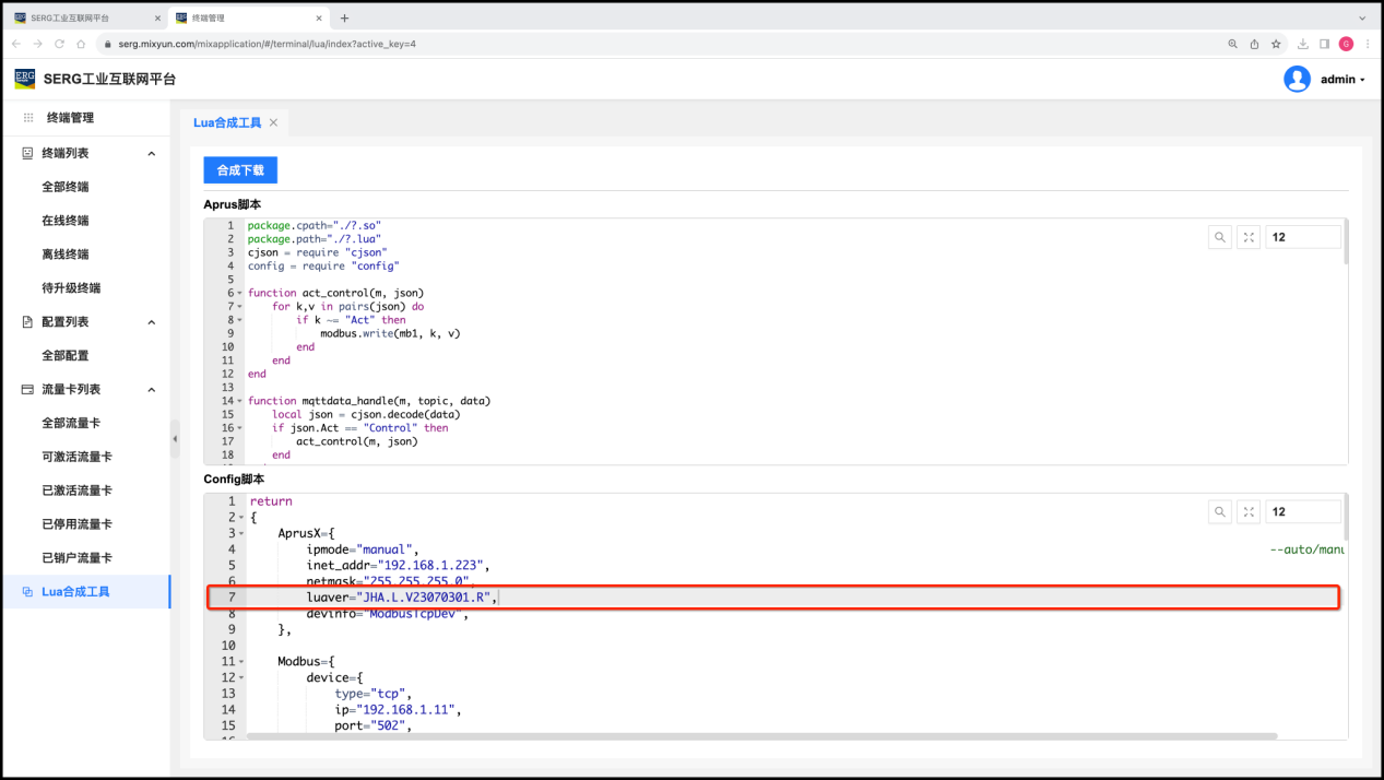 第一步,利用 “终端管理” 的 Lua 代码合并工具,把 Aprus 脚本和 Config 脚本合并。