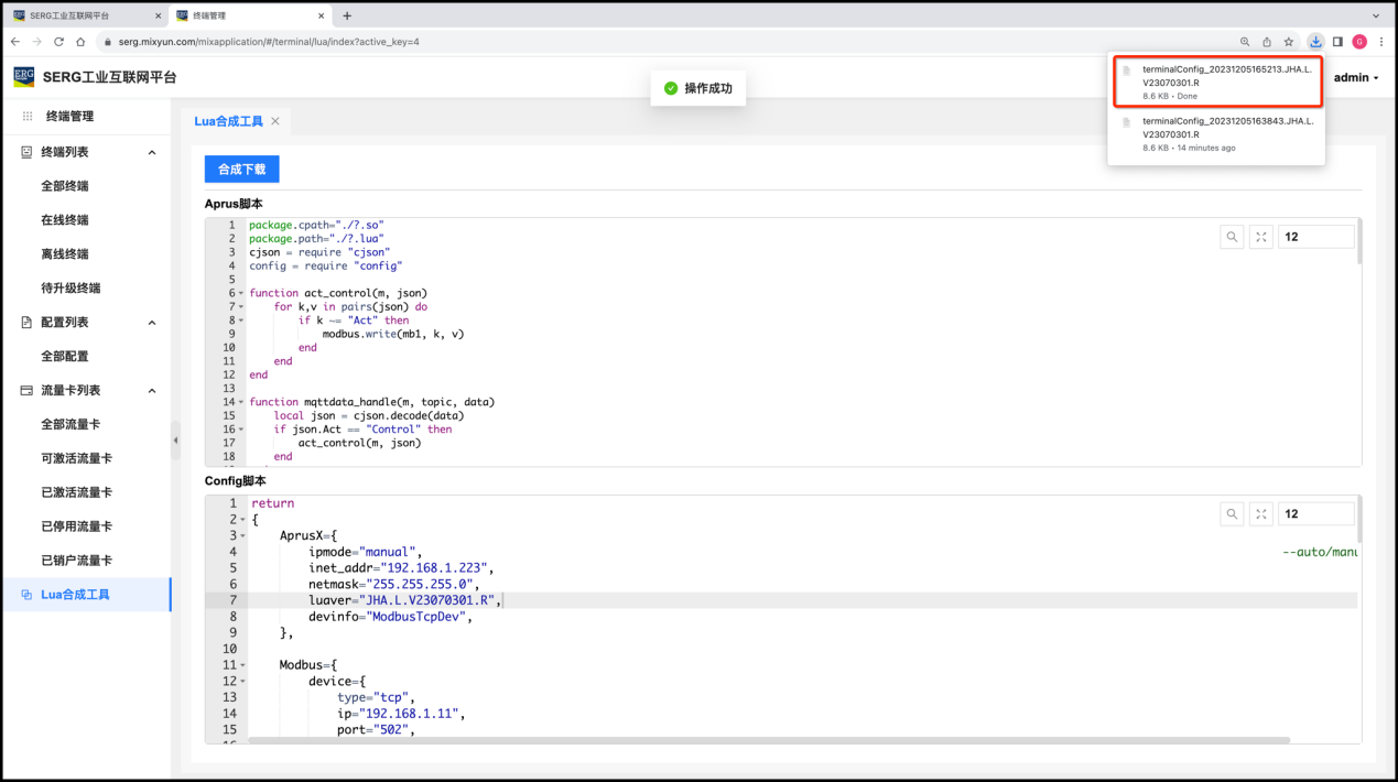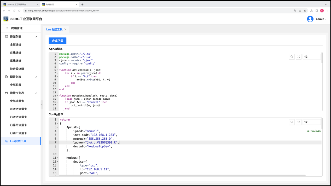 完成 Aprus 脚本(aprus.lua)和 Config 脚本(config.lua)编程后,可以使用 “终端管理” 应用提供的合并工具,把 Aprus 脚本和Config脚本合并成一个用来上传的 Lua 文件。