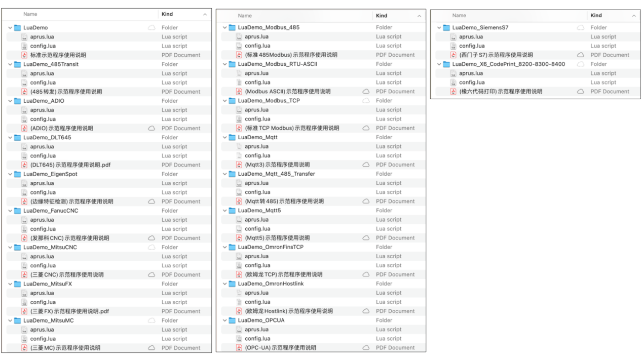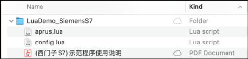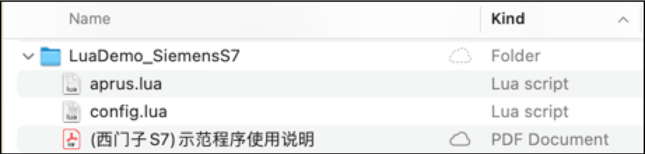 这些都可以从 MixIOT 技术支持获得。用更加通俗直白一点的话说,如果要对接的设备控制器是 “西门子 S7”,就找到这个目录,下载对应的 aprus.lua 和config.lua。