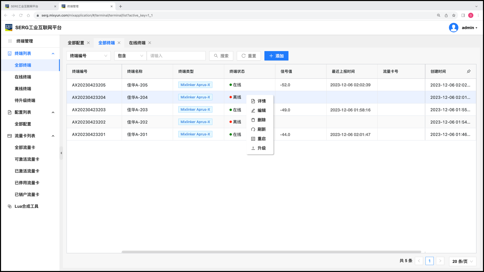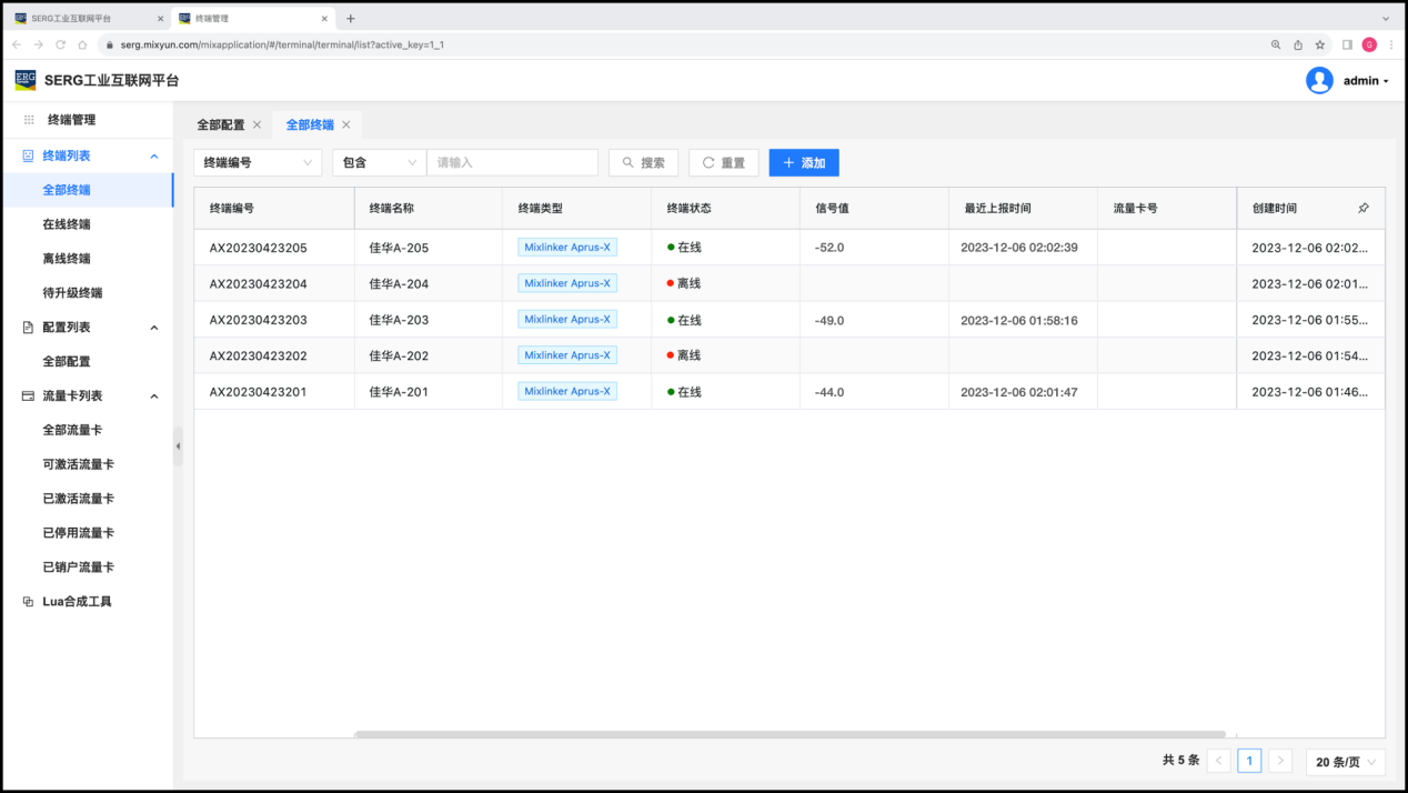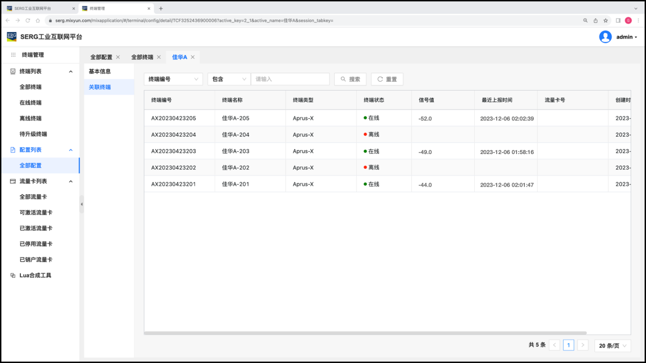 这是之前创建的以 “佳华A” 为配置的5个终端。这样,终端与配置就关联了起来。