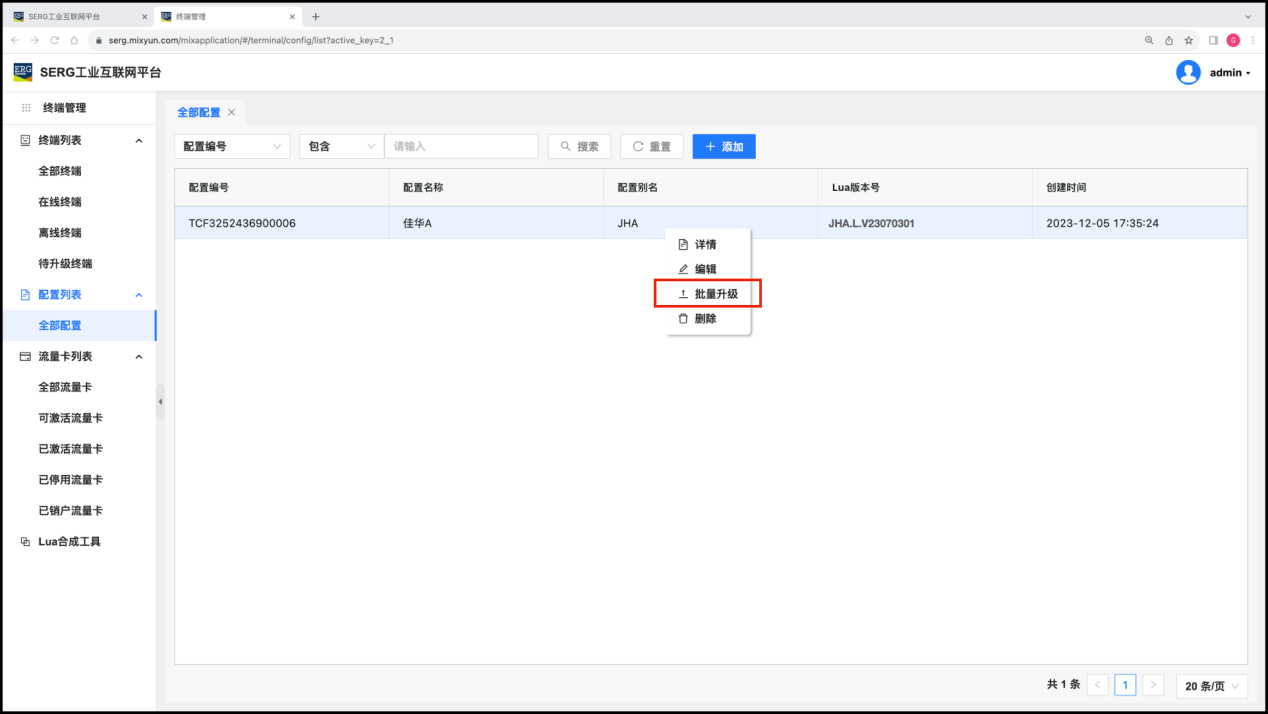 数据终端的升级有两个途径。一个是通过 “配置列表” 的 “批量升级” 操作。