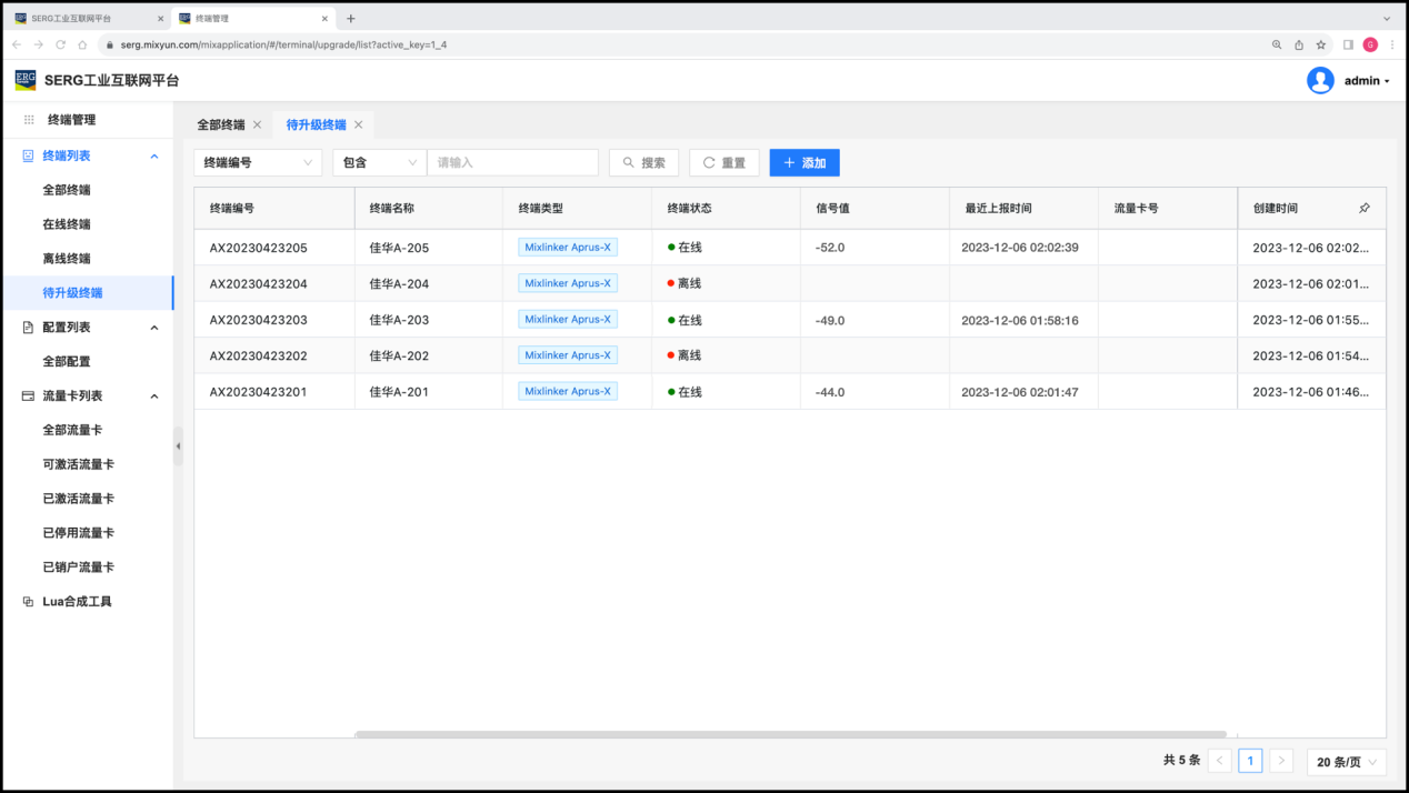 “终端管理” 终端版块的 “待升级终端” 是一个动态视图, MixIOT 会根据终端报文的情况来判断终端是否需要升级,并会把需要升级的终端自动归类到这个视图。