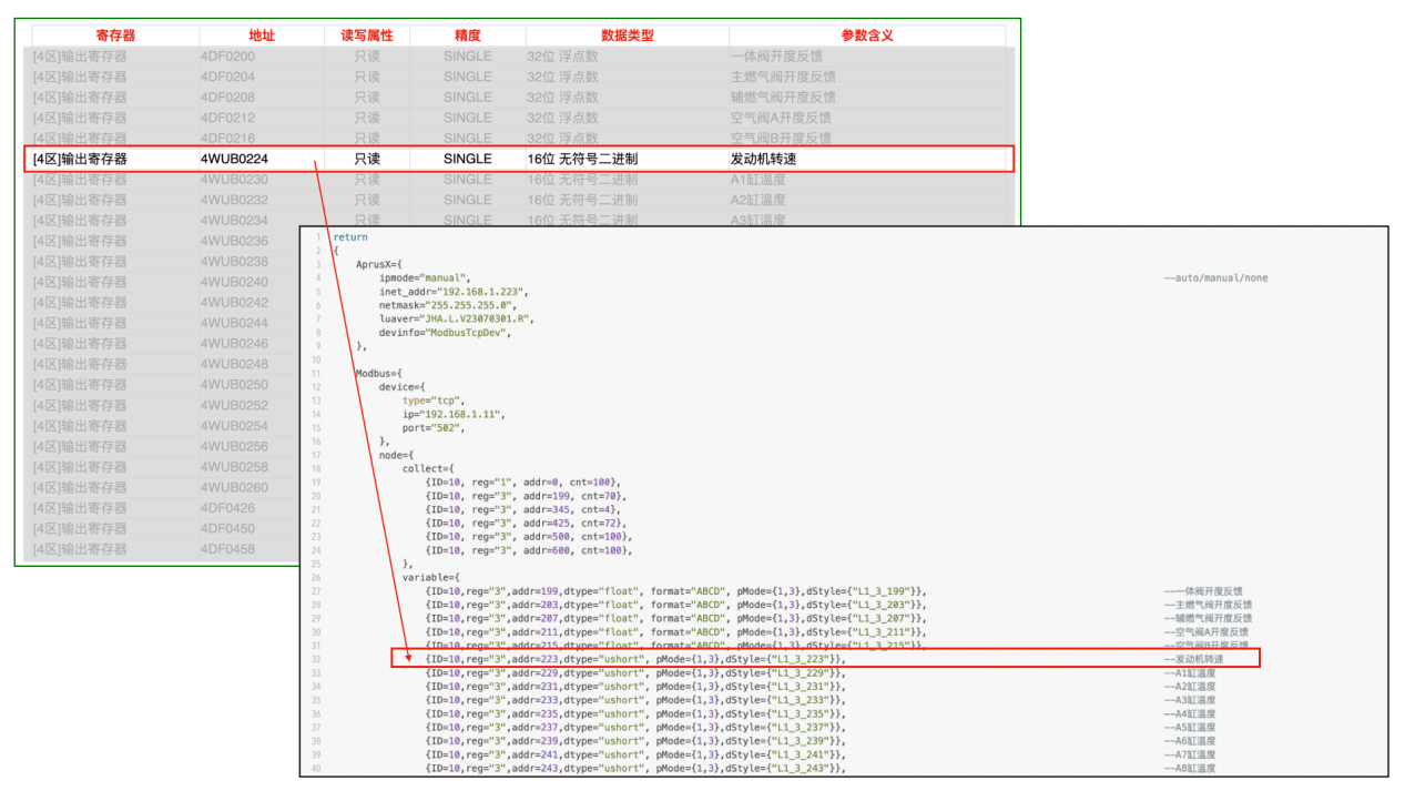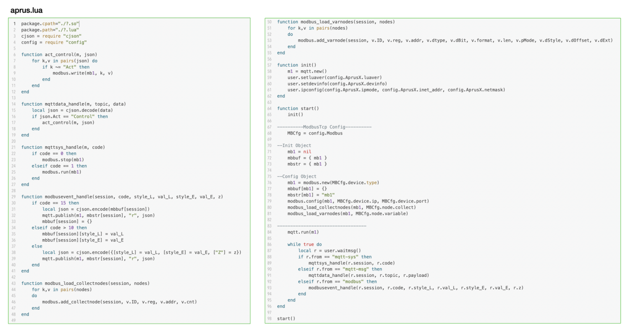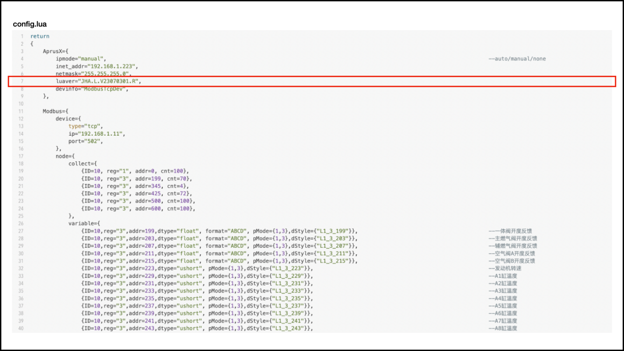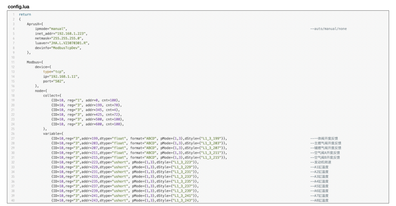 如果同一类协议的对接,aprus.lua 基本上是不会有什么改变的,具体对接什么,比如控制器、寄存器、地址、点位等等,这些东西全部都放在 config.lua里面。