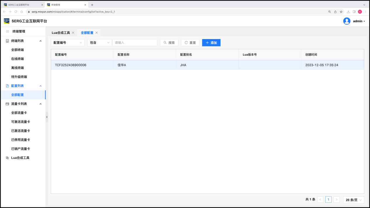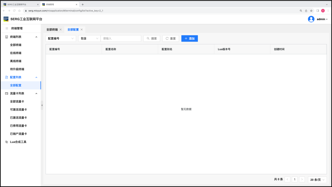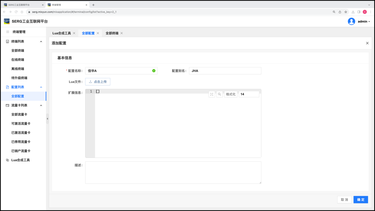 打开 “终端管理” 应用就很容易看到,应用有三个菜单(经常也称为三个菜单版块),分别是:“终端”、“配置”和“流量卡”。最后还有—个“Lua合成工具”。