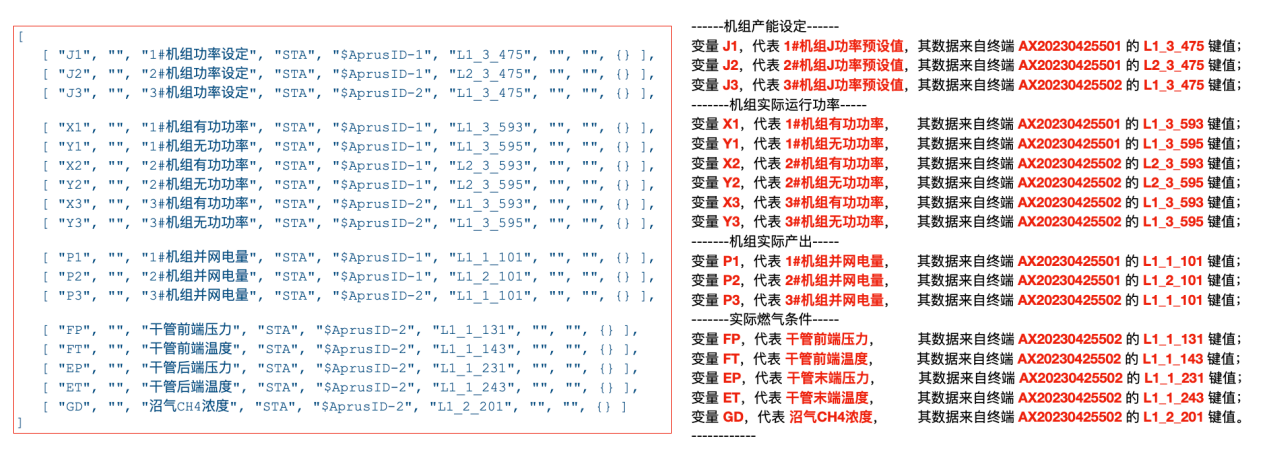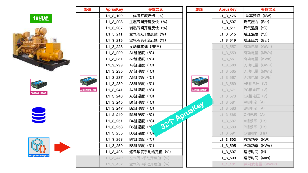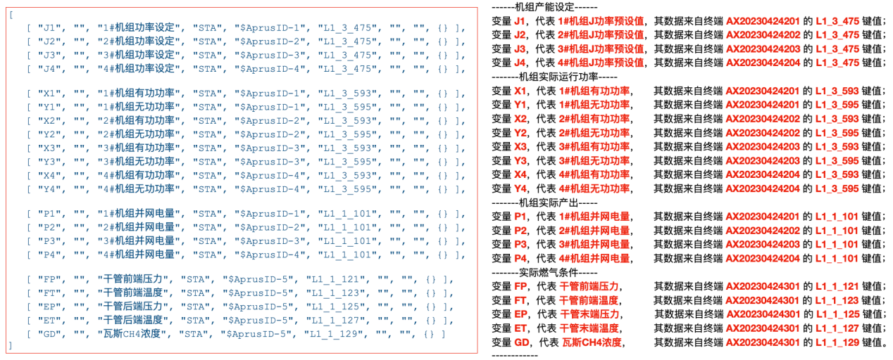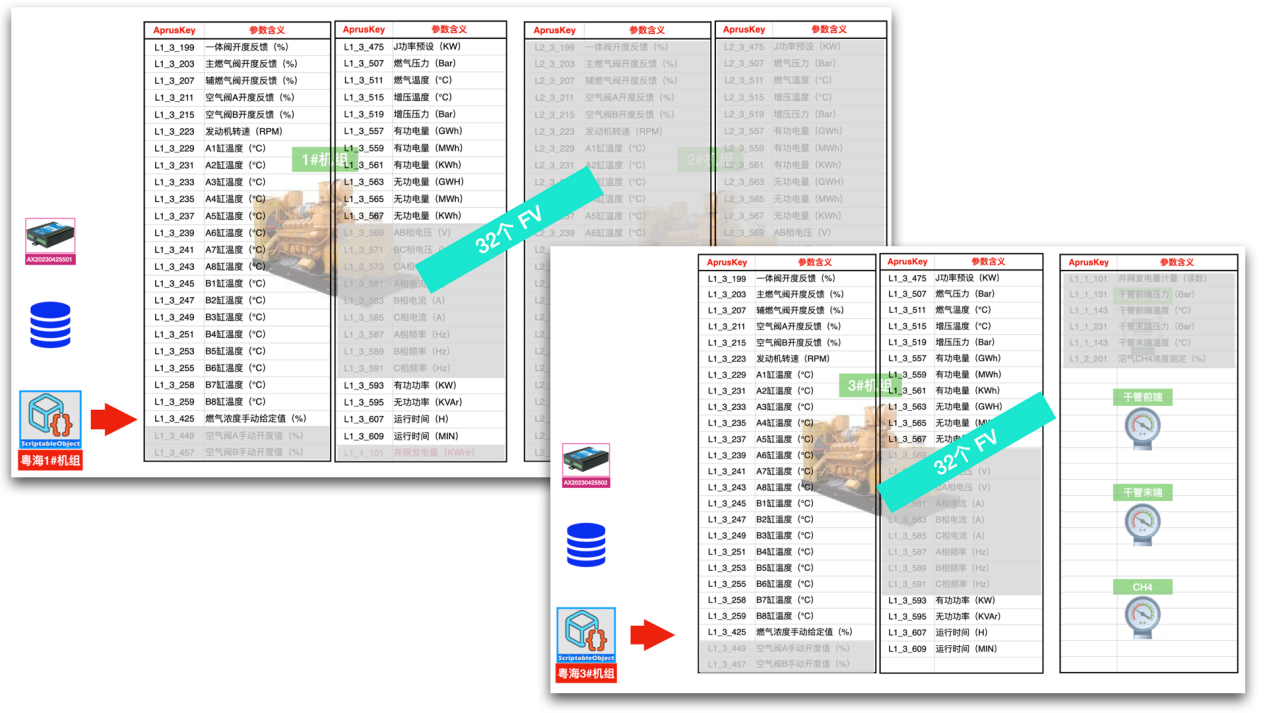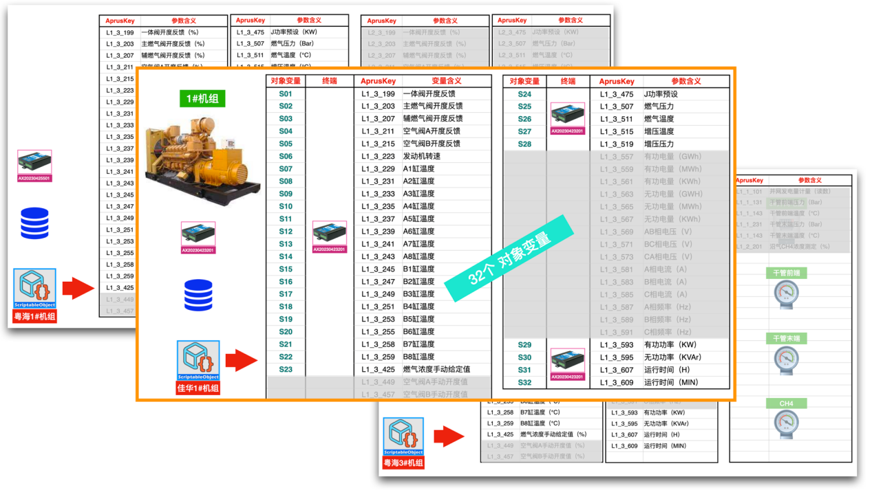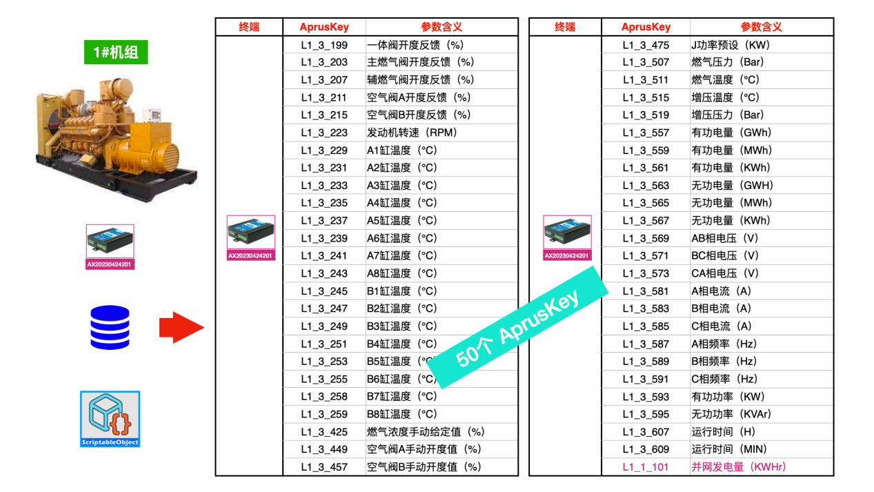 实际上,“$AprusID-1” 对应的就是 “排序为1” 的数据终端编号,也就是 AX20230423201。所以,这样写的脚本,对“佳华1#机组”这个对象而言,等价于: