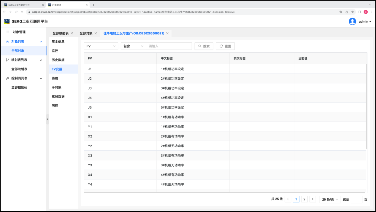 前面已经完成的5个对象,对应的是佳华电站的5台机组,其对象的FV变量分别是单台机组的一些重要的运行指标。我们创建这5个对象的目的,就是为了实时监控机组的运行情况。“实时监控”或“远程监控”是工业互联网做的非常基础的一件事情。