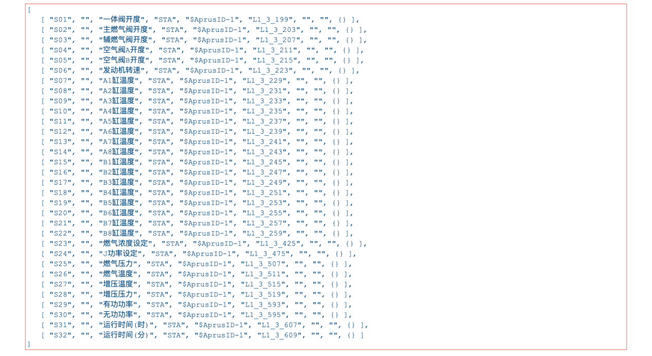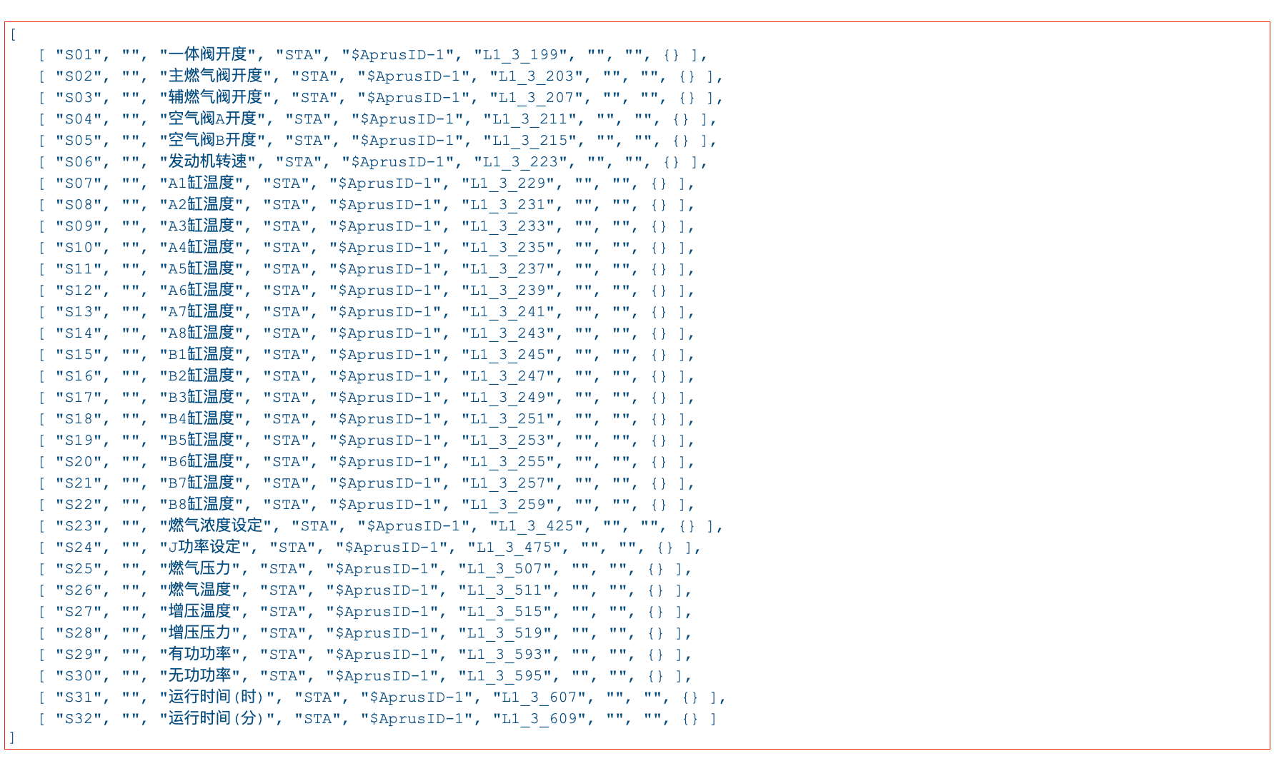 就很容易发现,奔腾电站对接机组的终端,采集的是50个参数,比佳华电站多了一个“并网发电量”,数据终端怎么对接机组进行数据采集的,我们不去管,但报文是完全一样的。而且机组运行这个对象,还是32个变量: