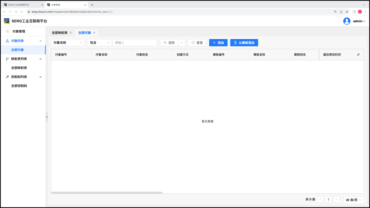 我们注意到,有一个内容在创建映射表的时候并没有涉及到:创建方式为 “非模板创建”,那按常理推断,就一定应该有 “模板创建”,这实际上就是 “对象模板”应用里面要讲解的内容。
