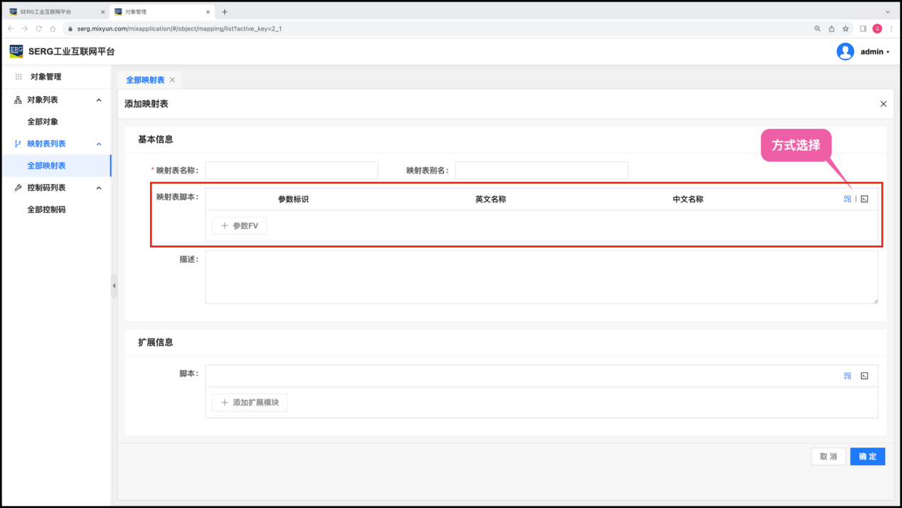 点击 “+添加”,可以选择 “界面化” 或 “脚本” 方式去创建映射表: