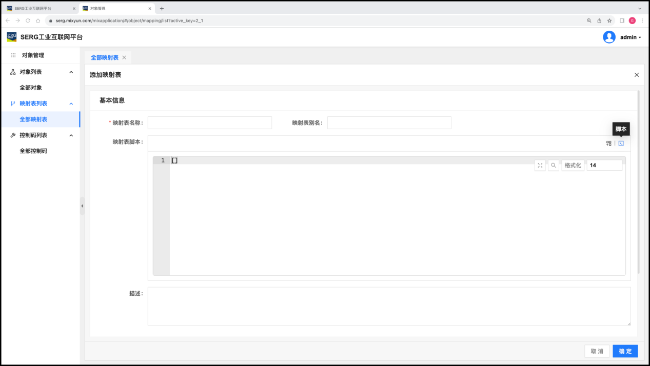 现在回到 “映射表” 的创建,点击 “+添加” 后,选择 “脚本” 方式创建映射表: