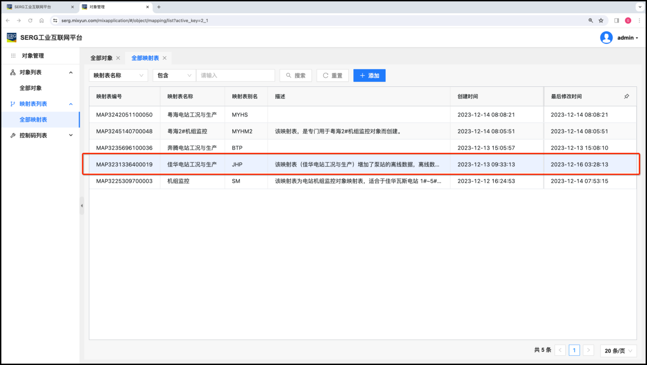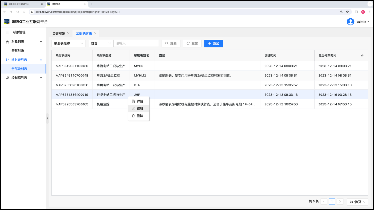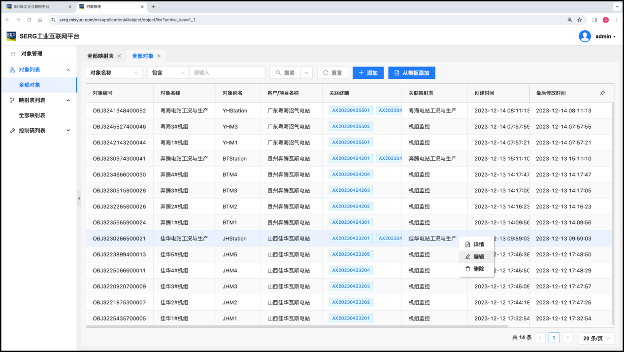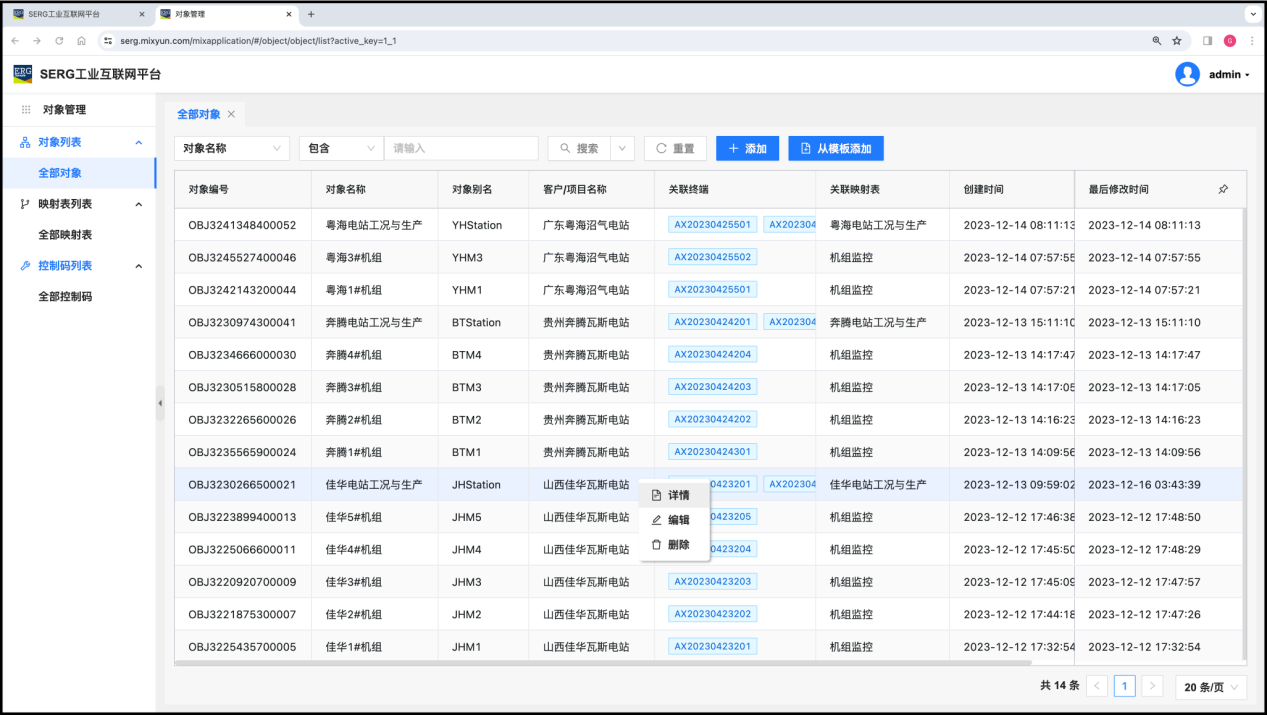 进入 “对象管理”,找到“佳华电站工况与生产”对象,打开操作菜单。