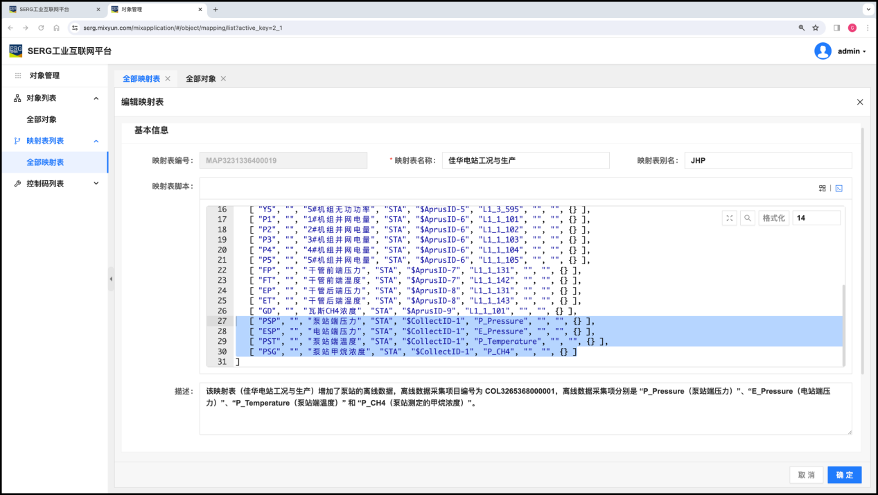 注意到,在修改 “佳华电站工况与生产” 这个映射表脚本的时候,离线数据项目编号是写死的。在这种情况下,其实最后有没有在对象中添加离线数据采集项目,都不会有什么影响。