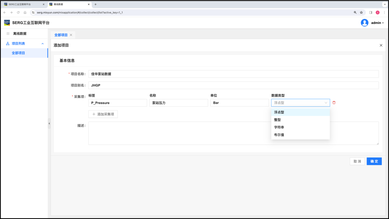 我们创建了第一个采集项,“泵站压力”,用 “P_Pressure” 作为这个离线数据采集项的标签。