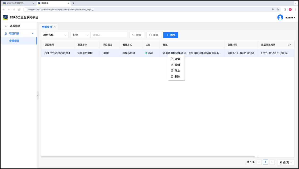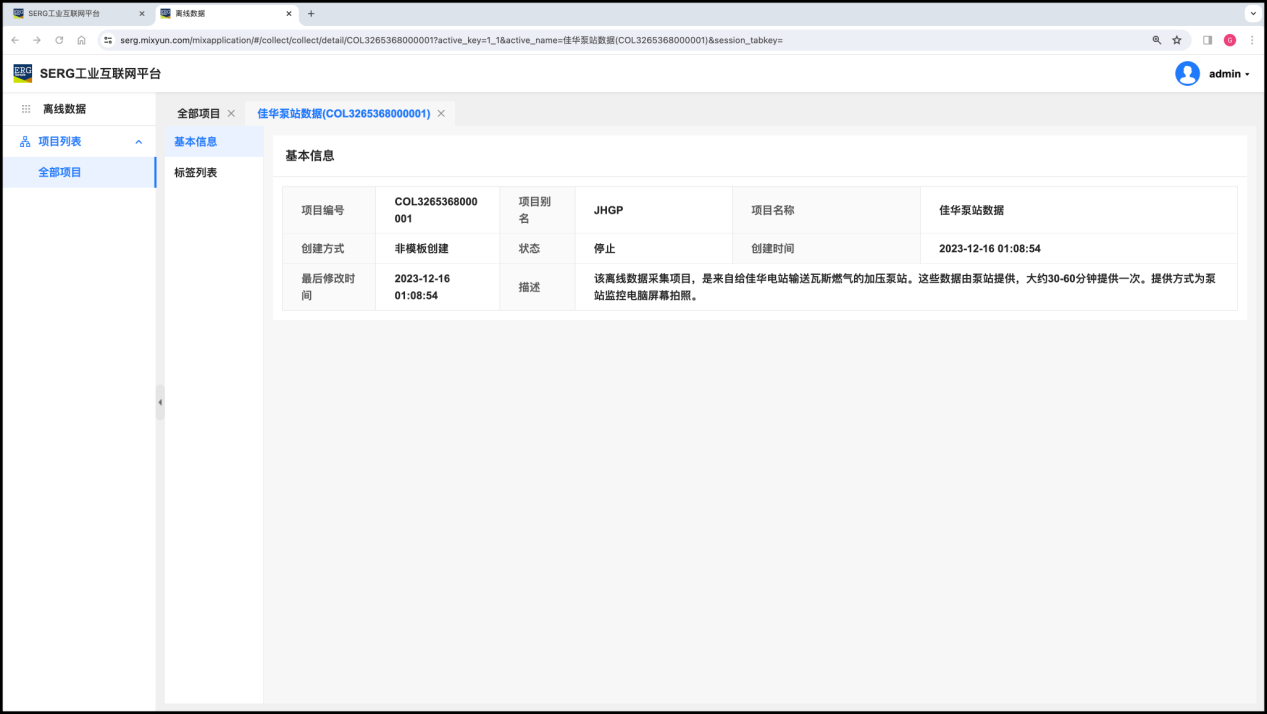 同样,我们可以查看项目的详情,还可以看到该项目所包括的离线数据采集项标签。