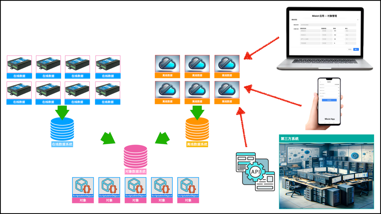 事实上, MixIOT 平台的离线数据应用并非只能处理低频采样数据,它也可以处理高频采样数据。也就是说 MixIOT 离线数据是一个外部数据来源的中转站,通过这些接口,先把外部数据导引到这个数据中转站,再把数据关联到对象的时序马赛克。