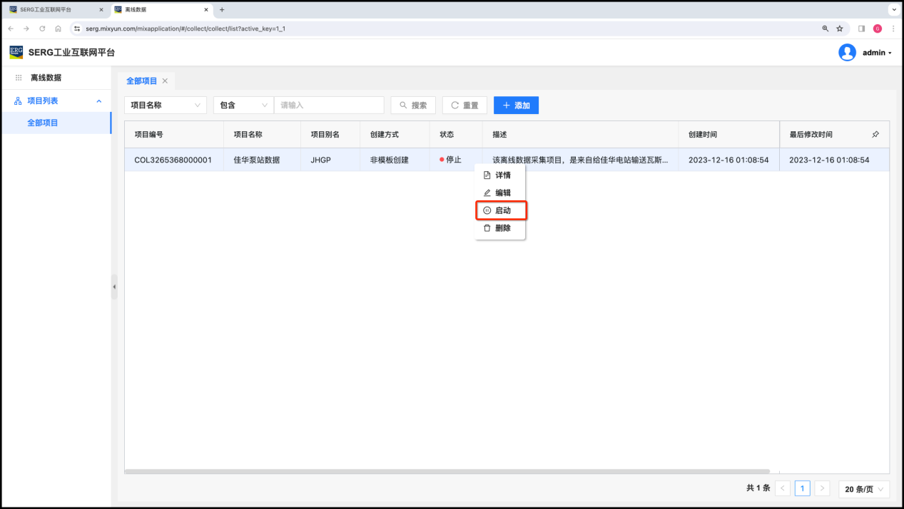事实上,离线数据采集项目不仅仅是一个 “离线数据采集项目的记录”,它同时还是一个 “服务”。一旦这个项目的状态是 “启动”,则说明整个服务就开始运行。当然也可以随时在操作栏上把这个服务停止。