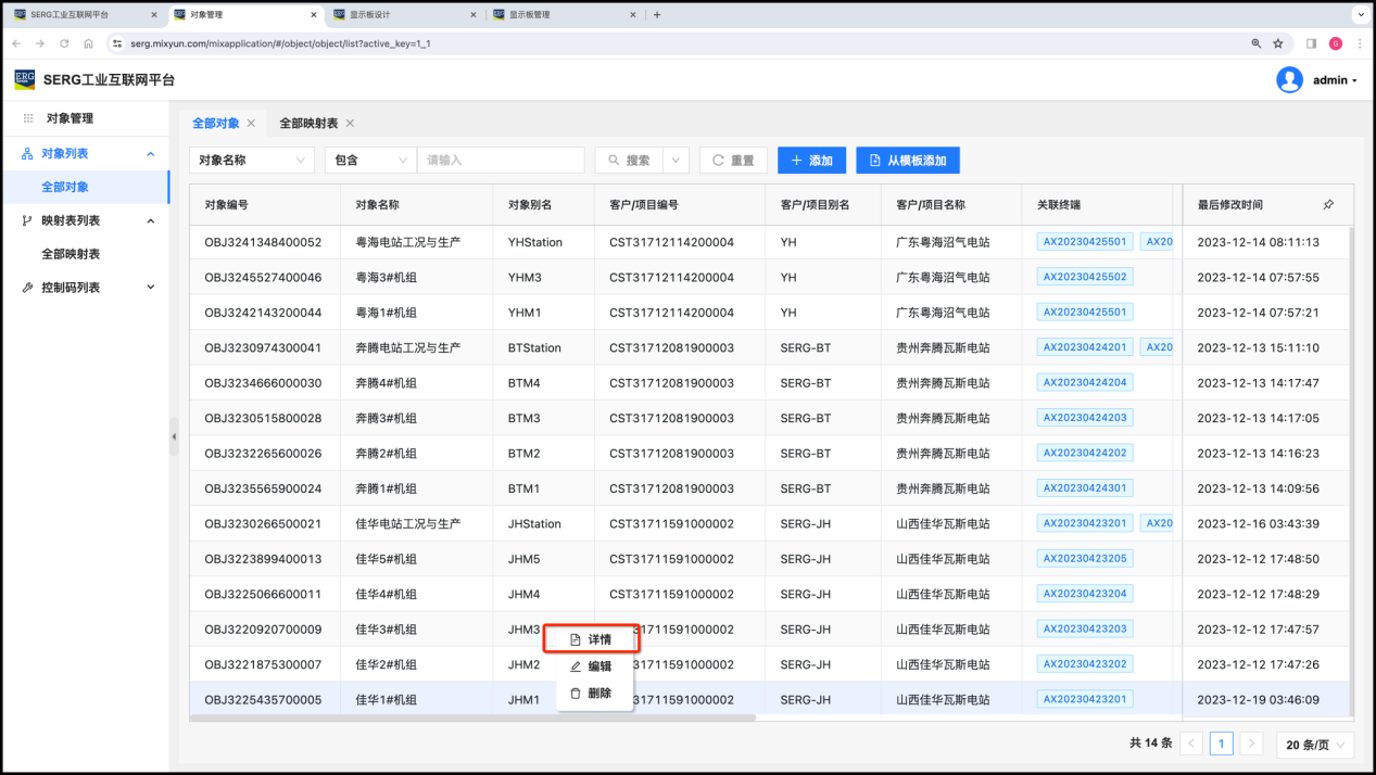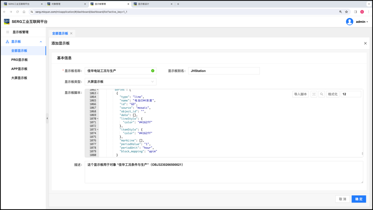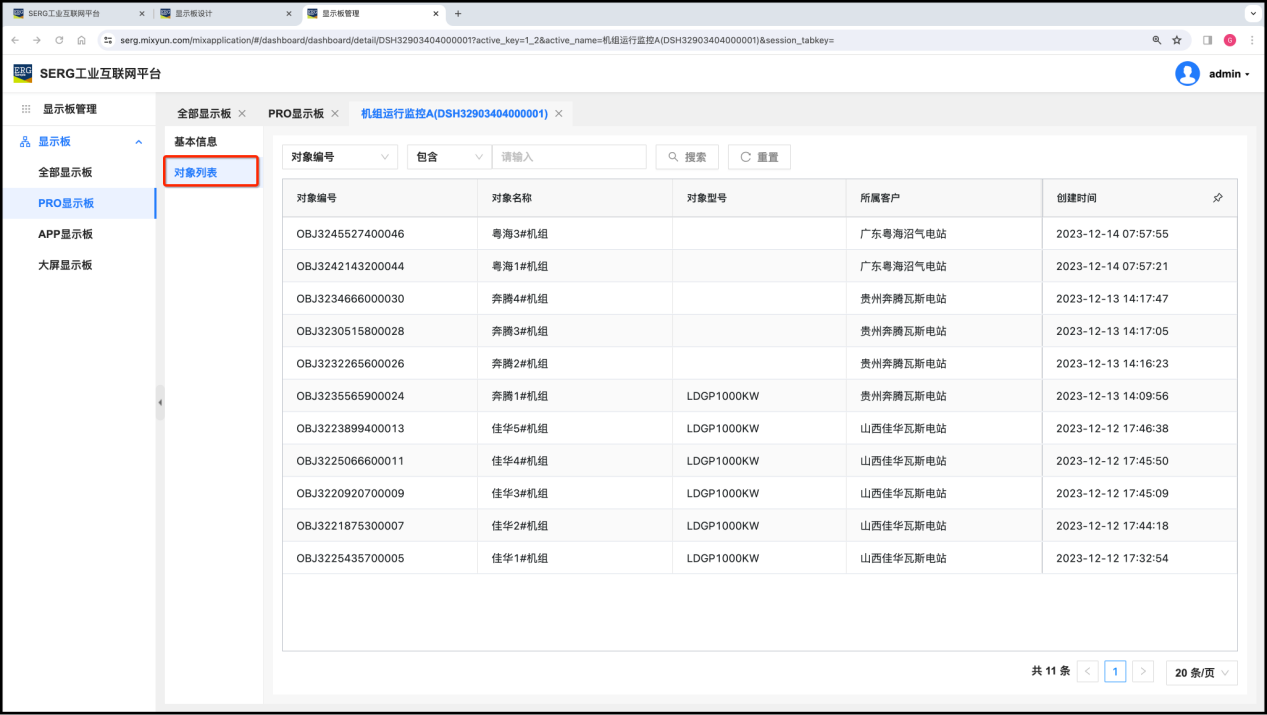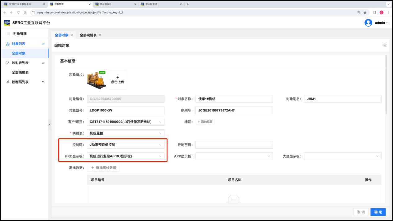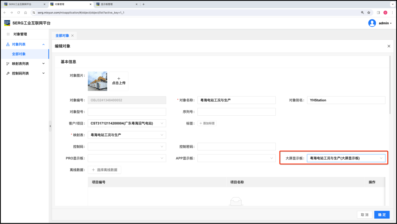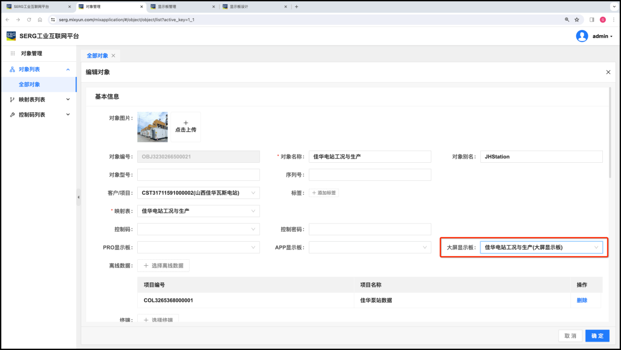 在 “对象管理” 应用中,把这个显示板与“佳华电站工况与生产”对象关联上: