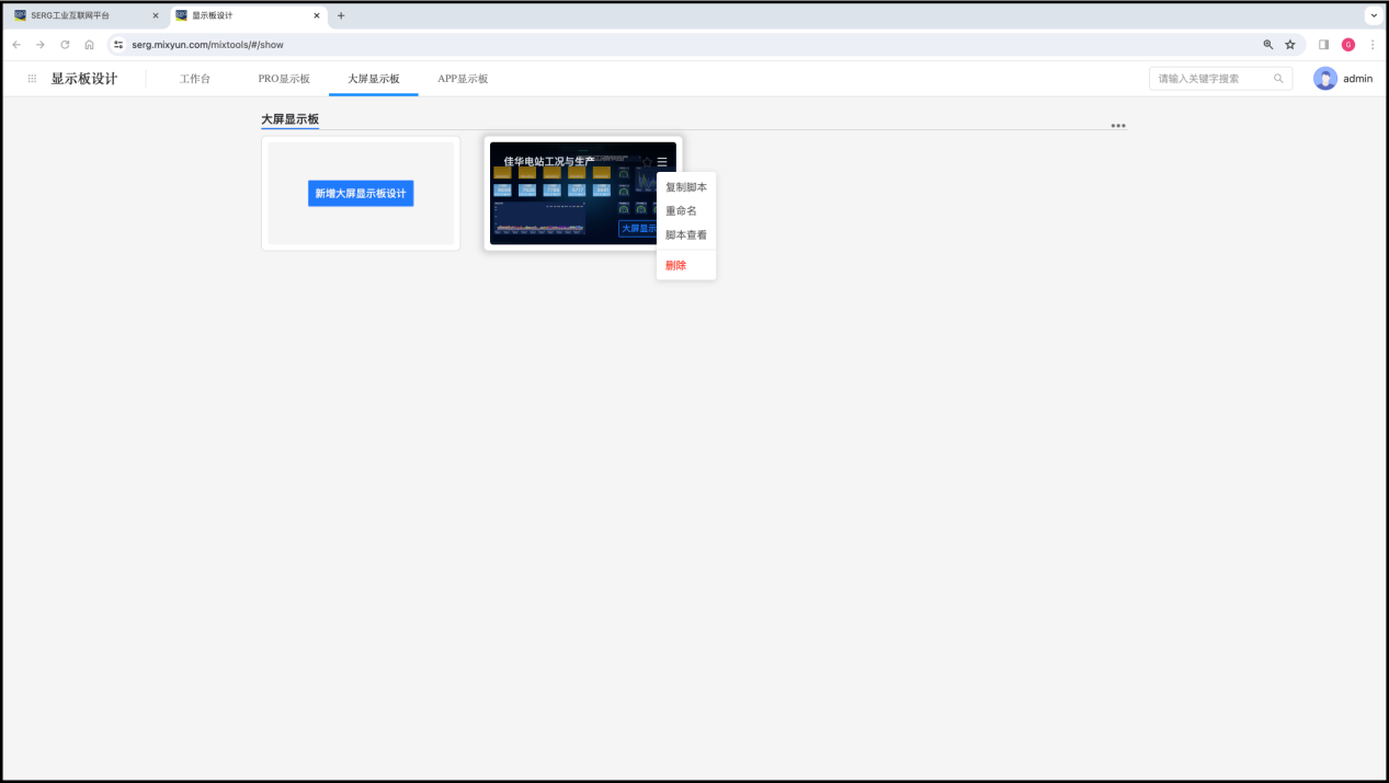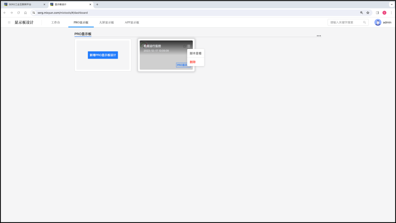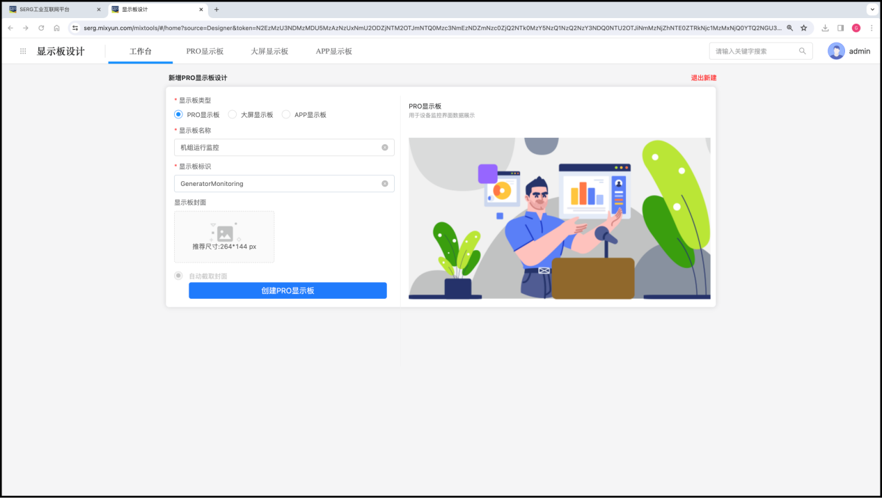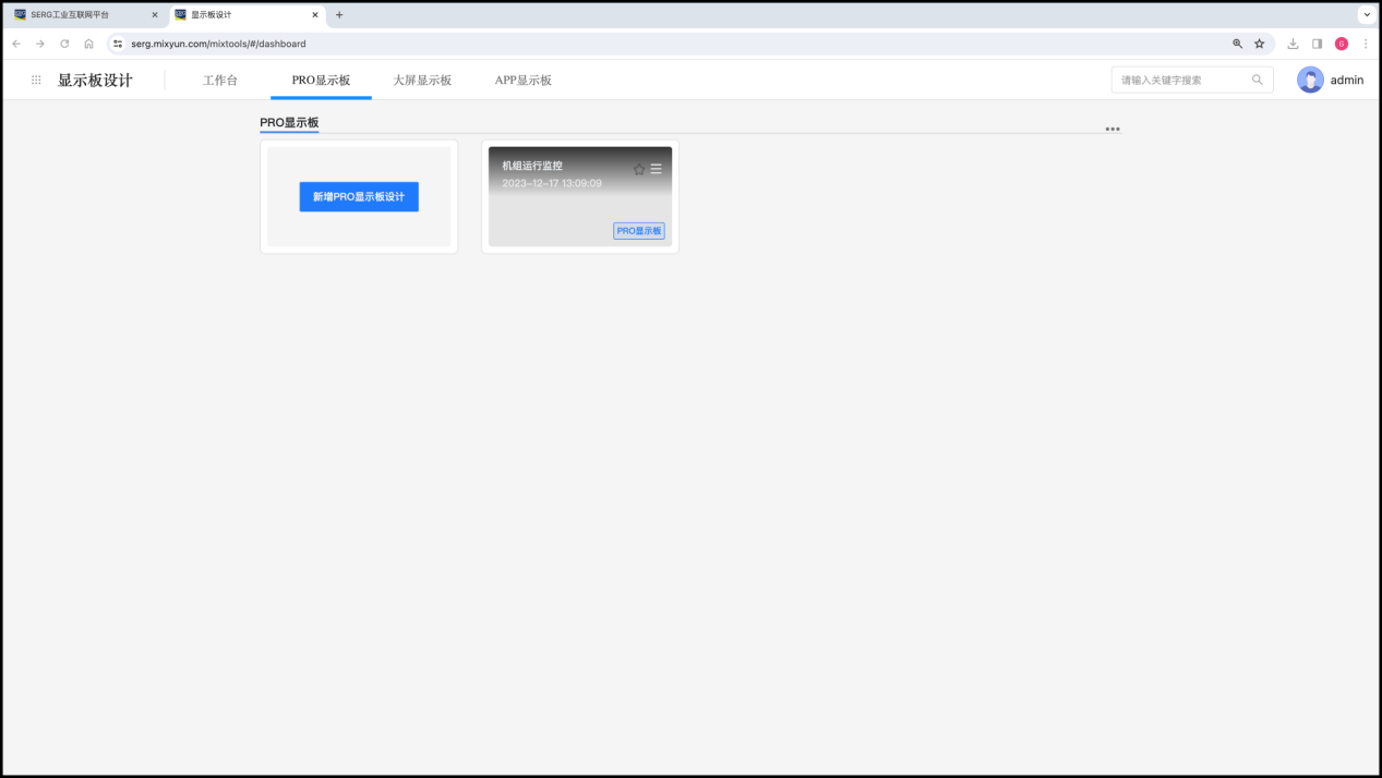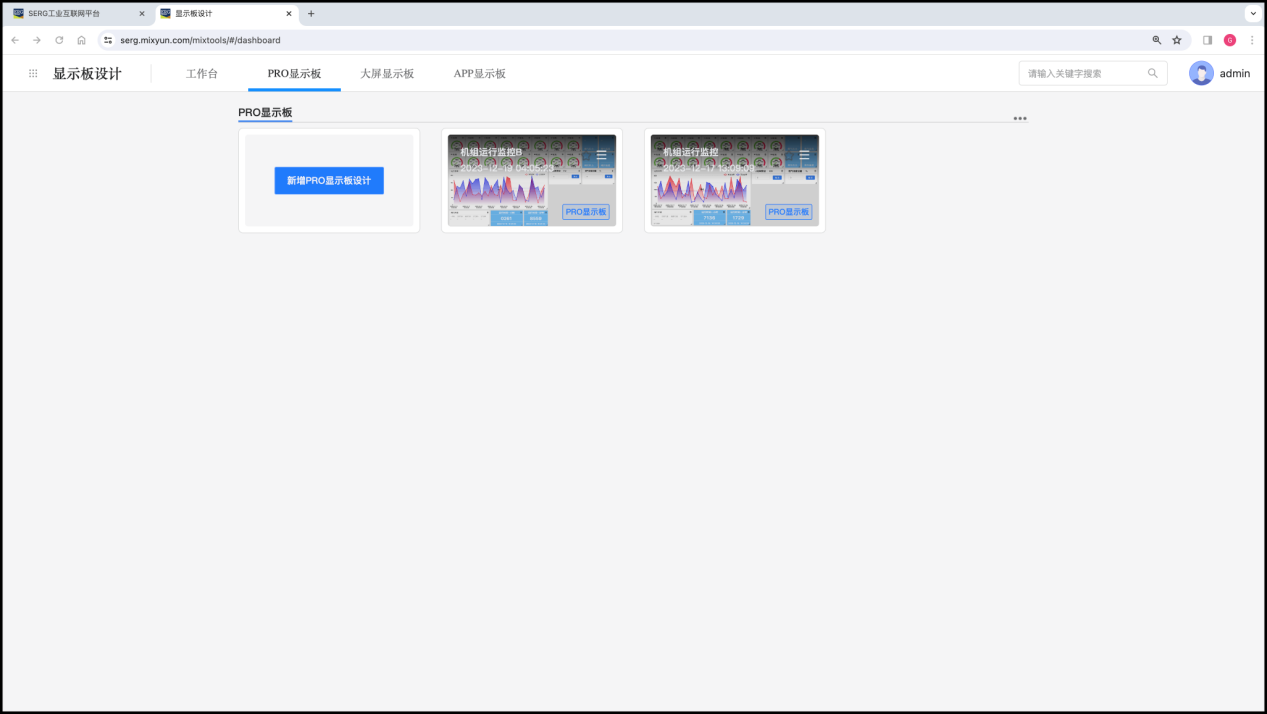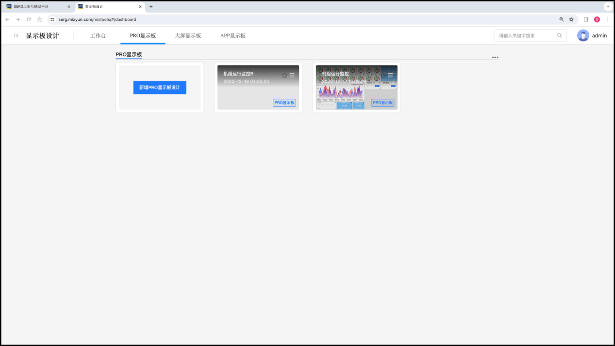 “显示板设计” 应用有4个栏目,分别是:工作台、PRO显示板、大屏显示板和APP显示板。