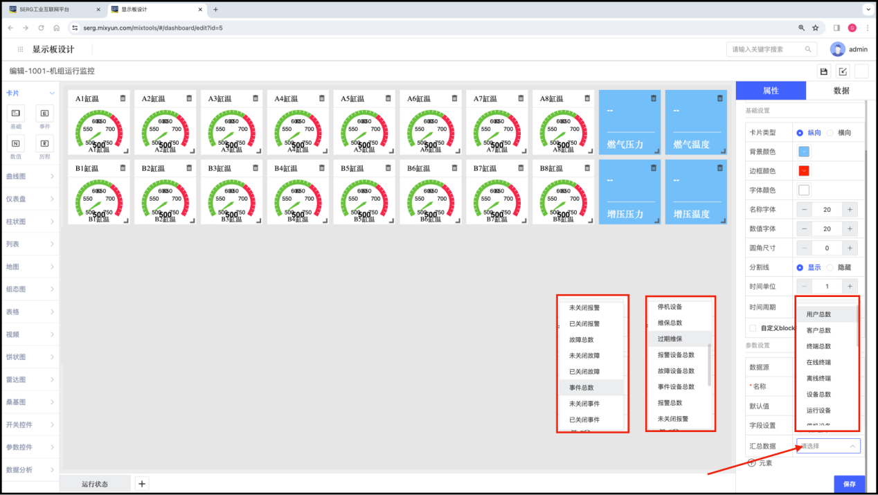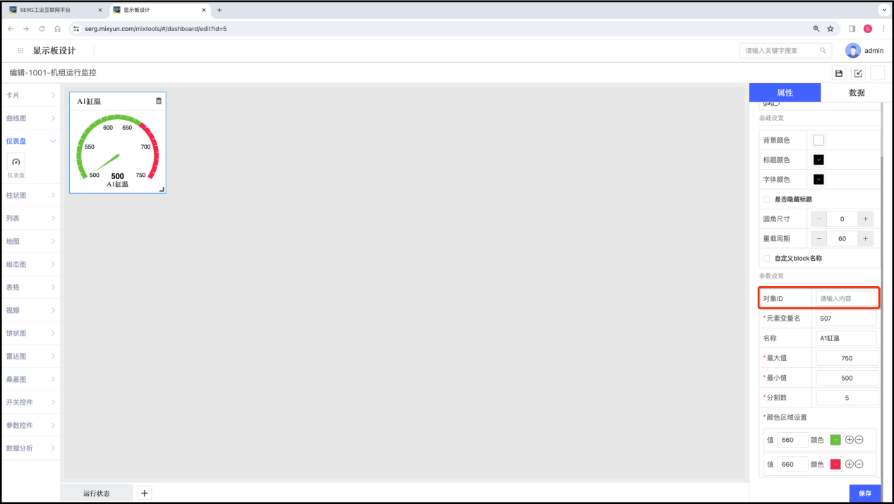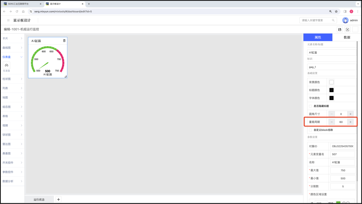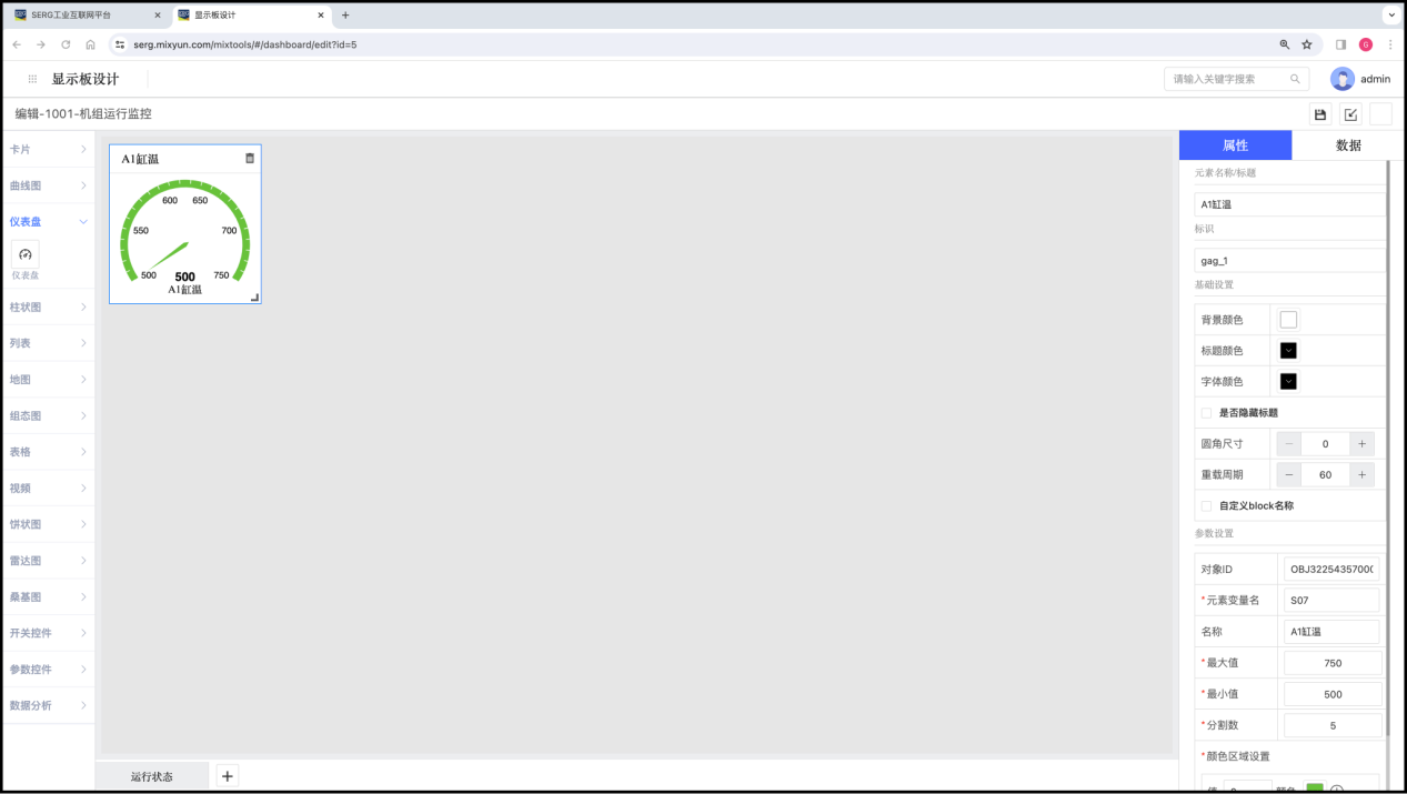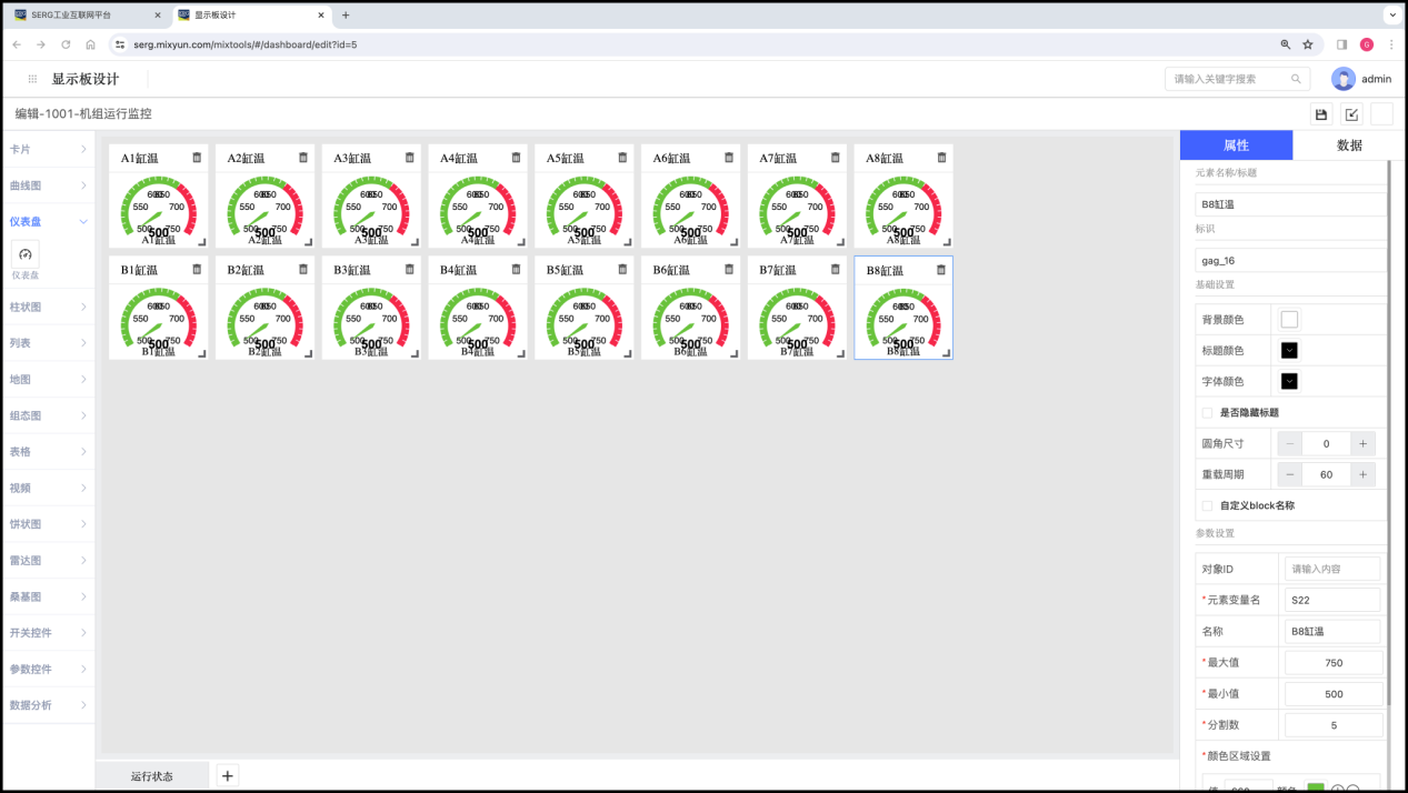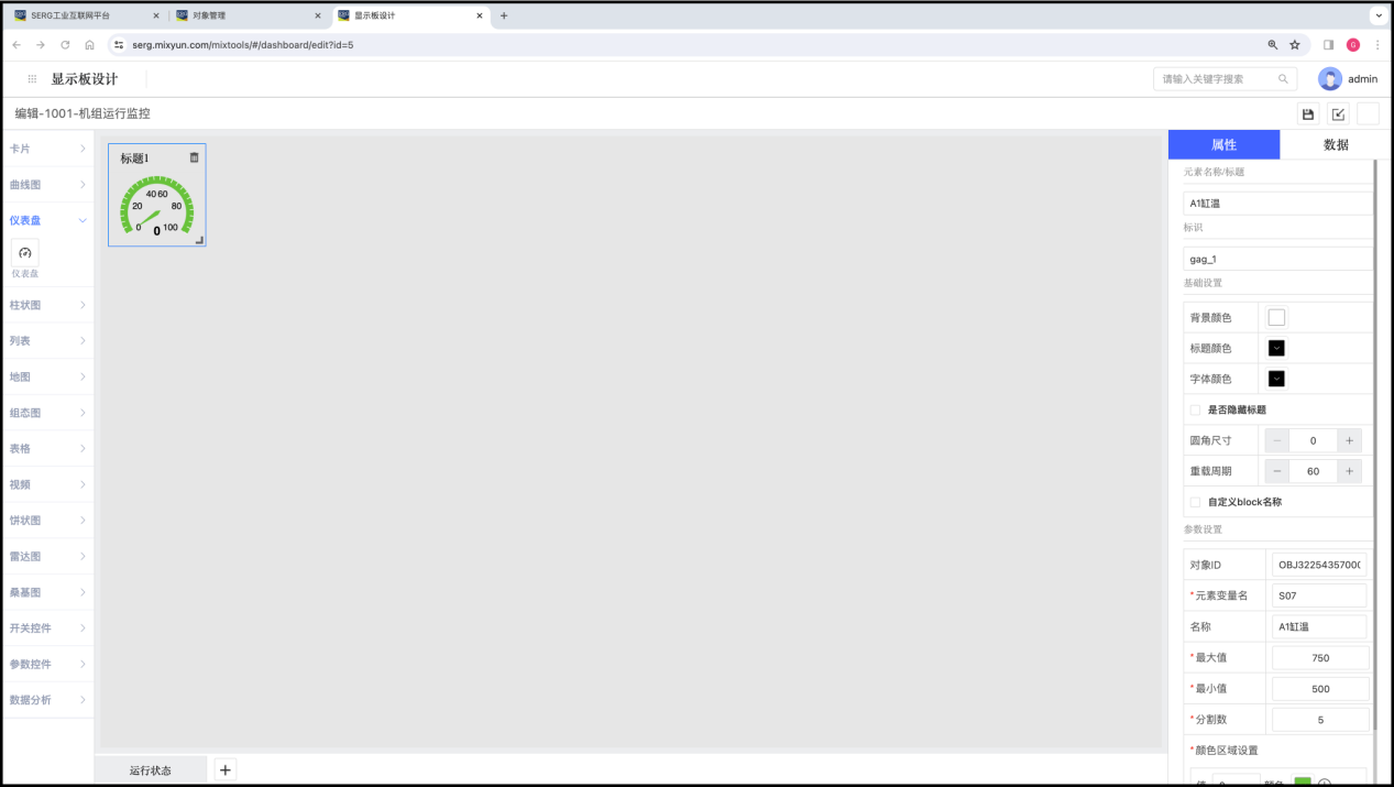 打开 “仪表盘” 元素区,把“仪表盘”元素拖拽到显示板页面上,我们打算用仪表盘显示A/B气缸温度。