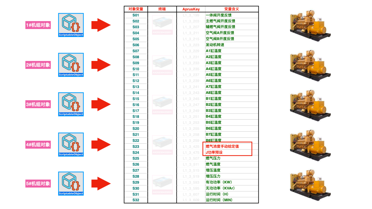 第一类,分别是“佳华1#机组”、“佳华2#机组”、……、“佳华5#机组”。当初在规划这些对象的时候,它们就用来作为发电机组设备运行的实时监控。所以,必须要给这些对象(各发电机组)做一个用来实时监控的显示板。