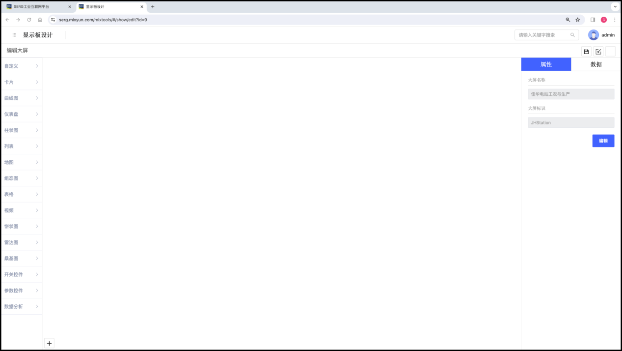 进入设计后能够看到,左边一列是设计元素;中间的区域是画布;右边的是属性和数据编辑器。