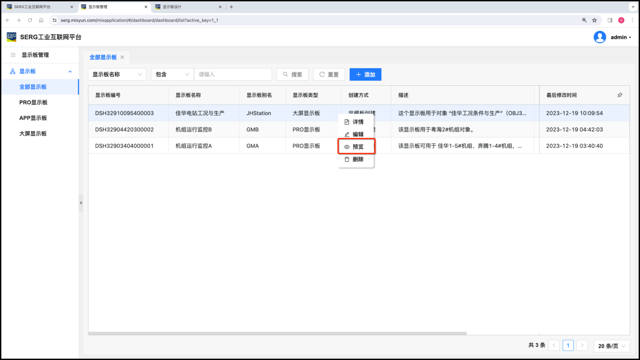 在“显示板管理”中,可以对这个大屏显示板进行预览:
