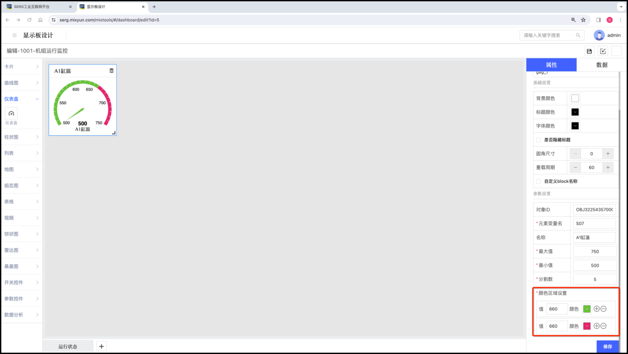 仪表盘元素颜色分区设置,可以设置温度超过660就是红色报警。