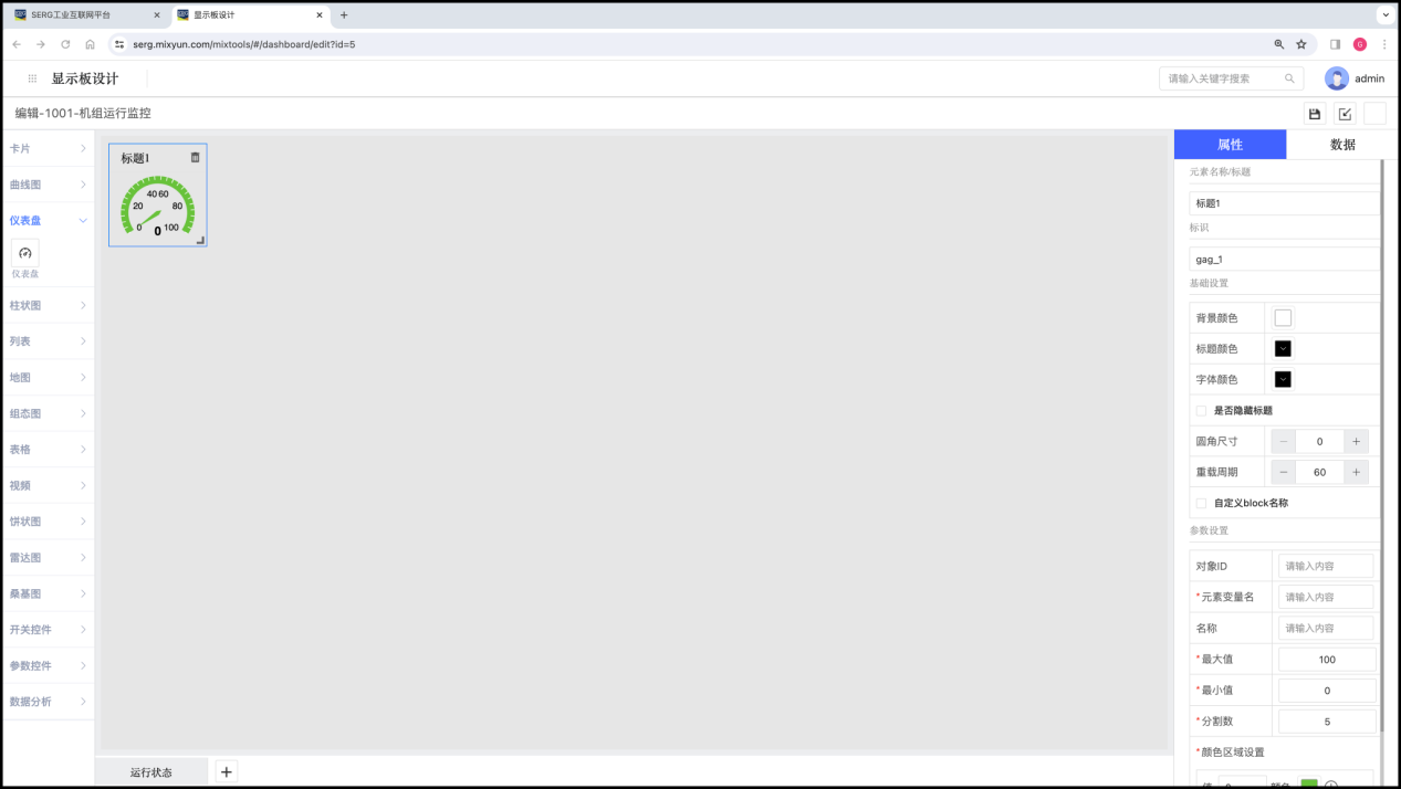 当我们把“仪表盘”元素拖拽到“运行状态”这个显示页面后,焦点就落到了这个仪表盘元素上了,这时可以对这个“仪表盘”元素进行属性编辑: