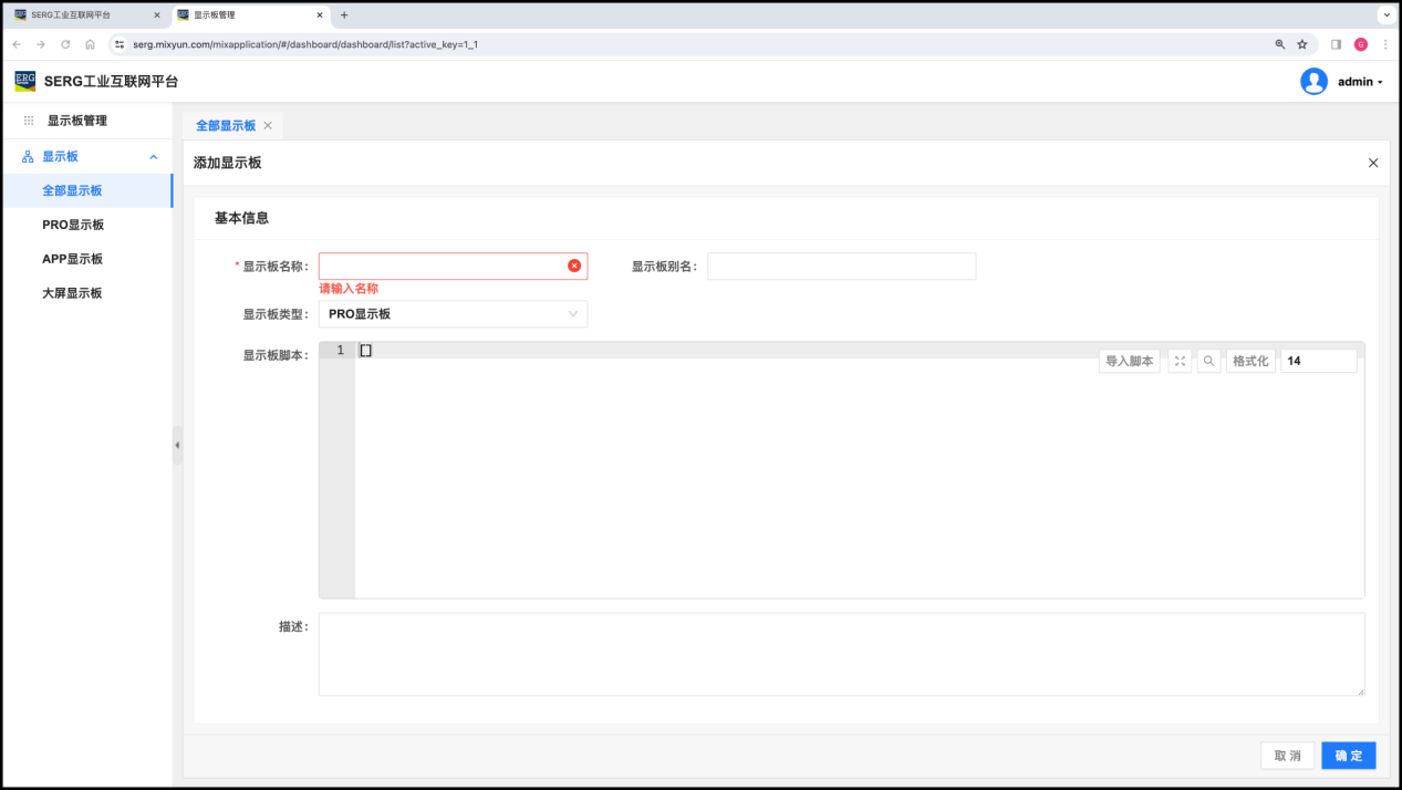 填写要创建显示板的相关信息,还要把刚才完成设计的显示板脚本复制一下,粘贴到显示板脚本编辑框里面: