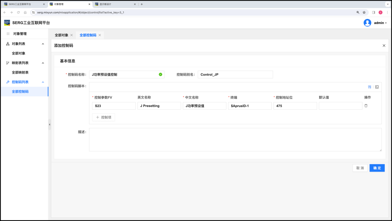 这里要注意的是,其中一个属性设置项是“控制码”,目前还没有,但我们知道这个是用来控制“J功率预设值”的,所以可以把控制码写成“Control_JP”,回头需要在“对象管理”里面,把这个控制码补上。