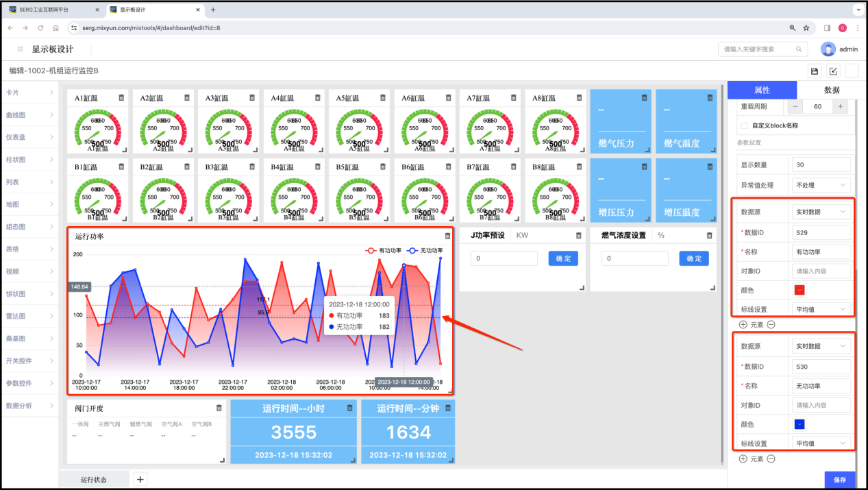 选择其中任意一个设计元素,比如运行功率(有功功率、无功功率),看一下相关的属性项有什么需要调整的: