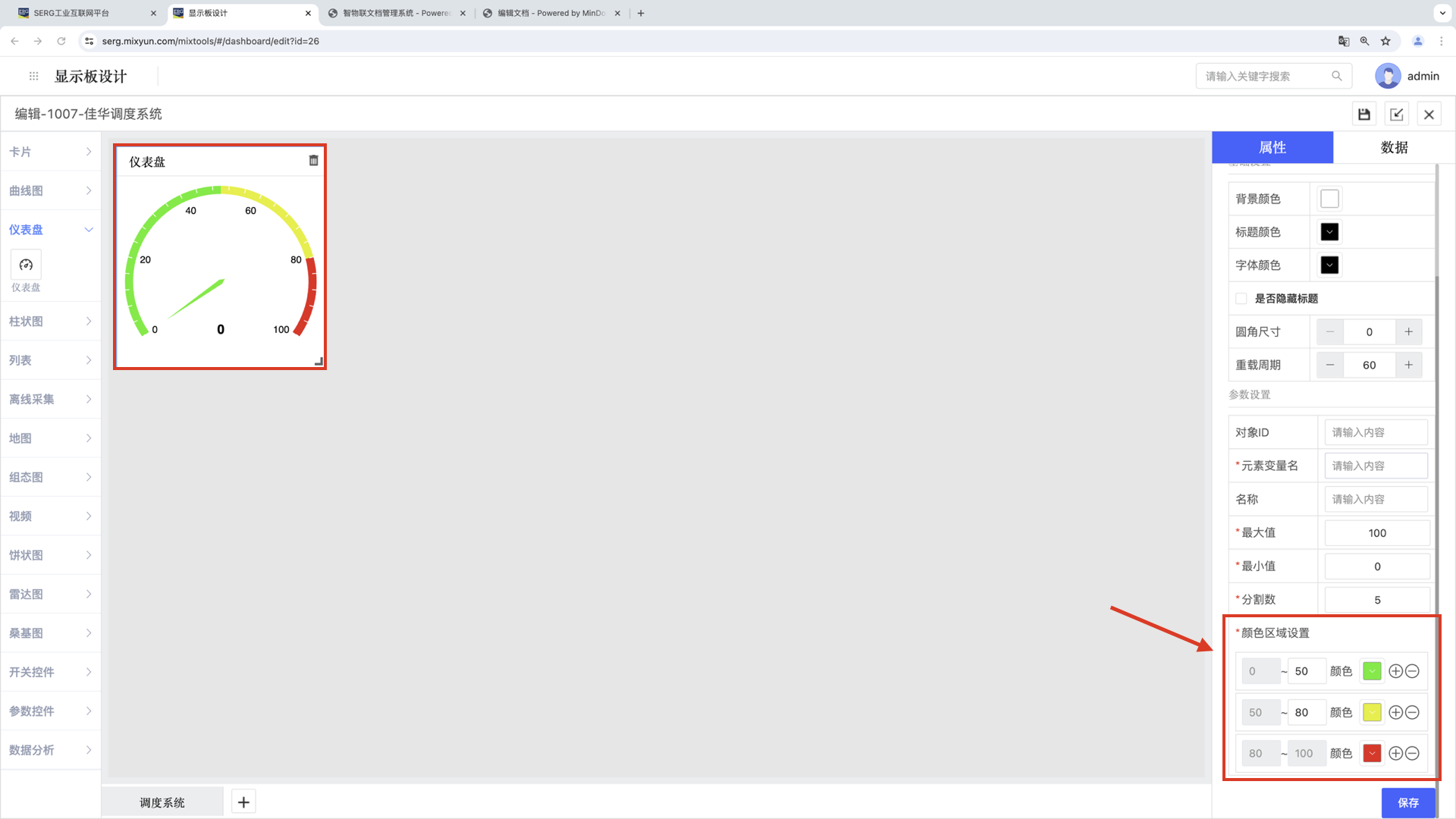 仪表盘设计元素支持仪表盘的多区段标识,也就是把数值分成多区段,用不同颜色来区分: