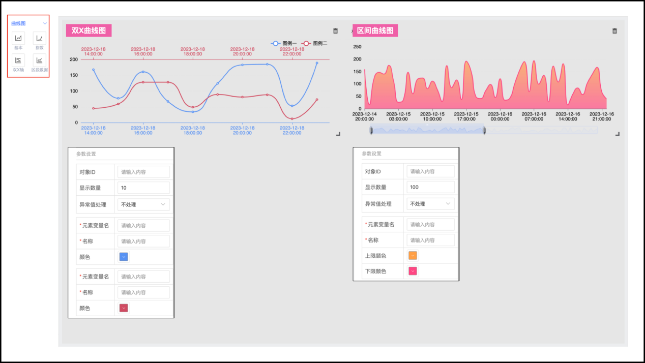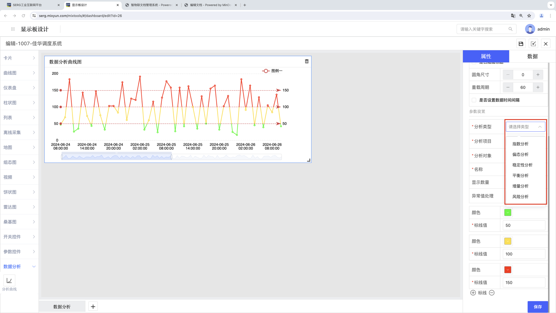 曲线图设计元素的属性设置,我们就不在这里详细描述,可以参考《Mixiot 显示板设计详解》 文稿,或参加智物联组织的显示板设计培训。