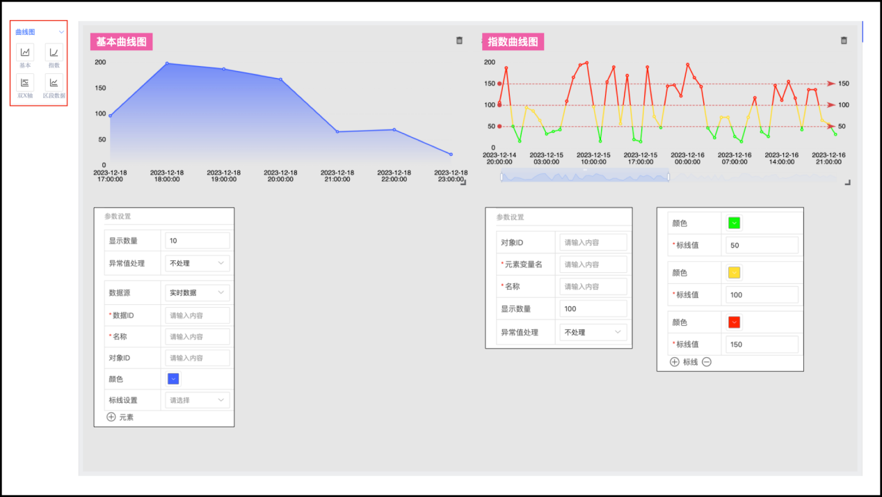 指数曲线图是一种显示标线的曲线图,且可以设定标线区段的不同数据颜色。在 MixIOT 系统中,通常会构造许多指数,比如,用来衡量空压机运行效率的汽电比指数;用于表示锅炉能耗的能效指数,等等。这些指数都可以用指数曲线图来展现,通过设定标线,对指数所反映的实际情况有非常直观的呈现。