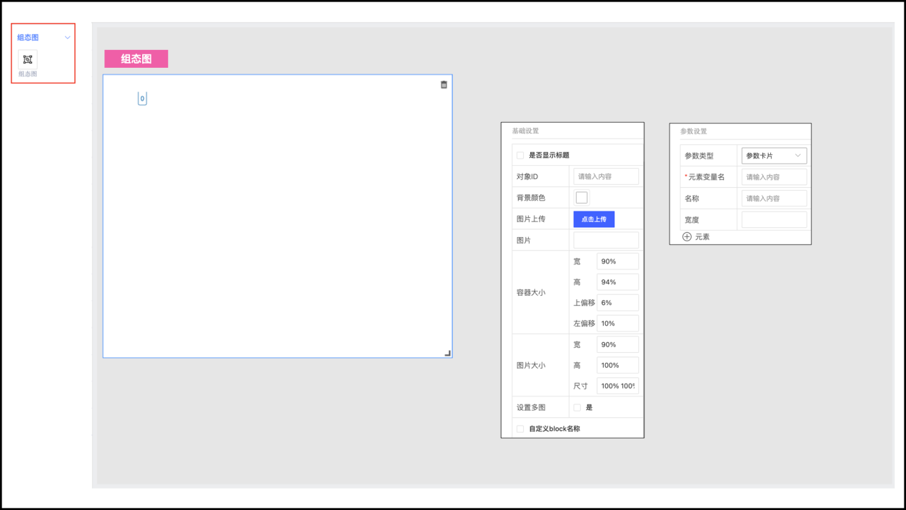 组态图设计元素由两部分组成,即 “底图”(或者“背景图”)和 “组态参数”。组态图元素支持多底图,以及动画格式,可以通过变量值条件,决定多底图的选择。