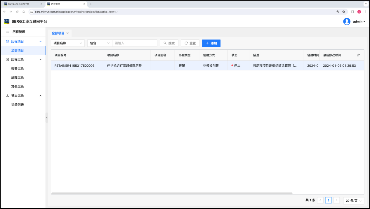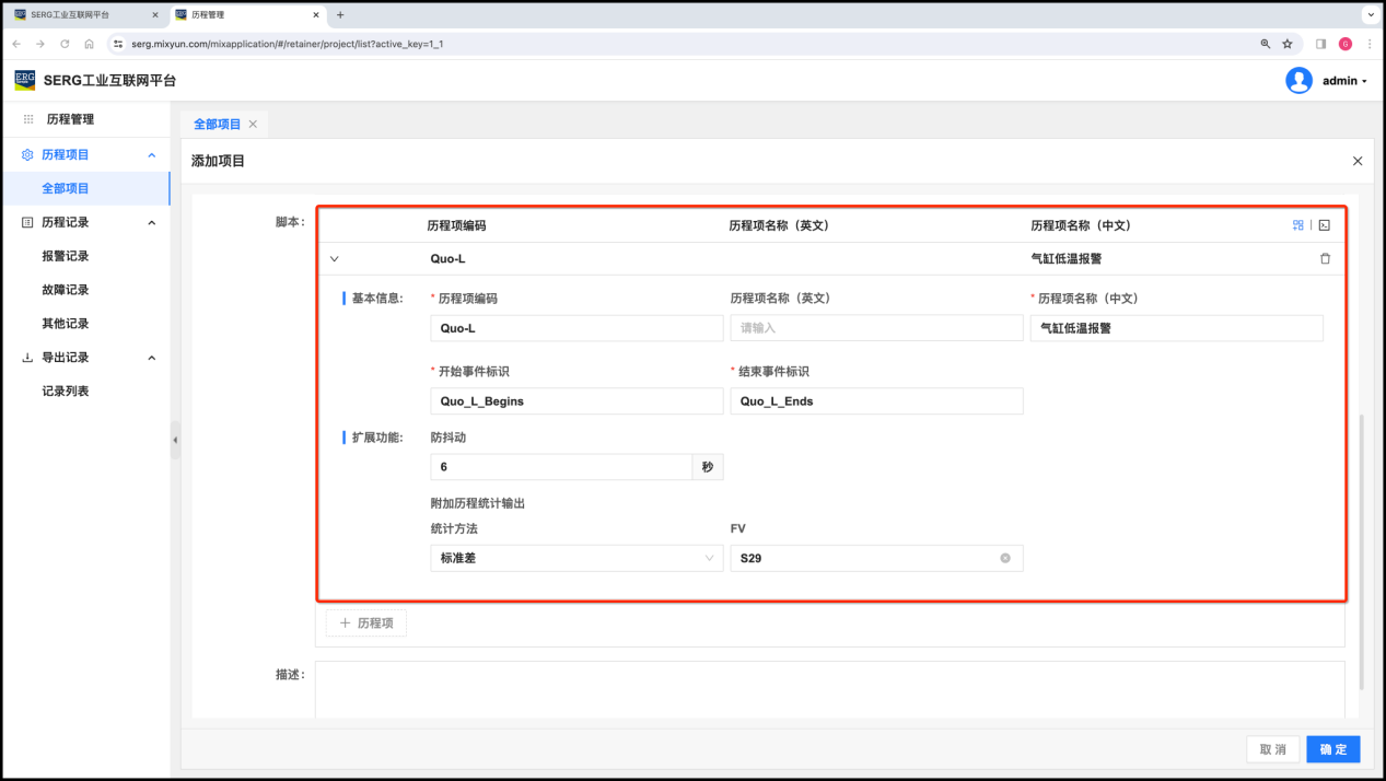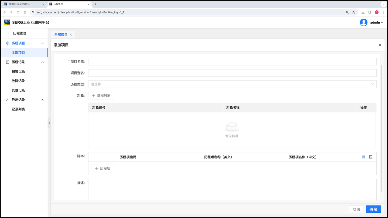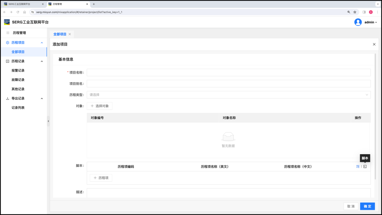 有了缸温超限历程的研究对象,就可以开始创建历程项目了。进入 “历程项目” 版块,来创建历程对象: