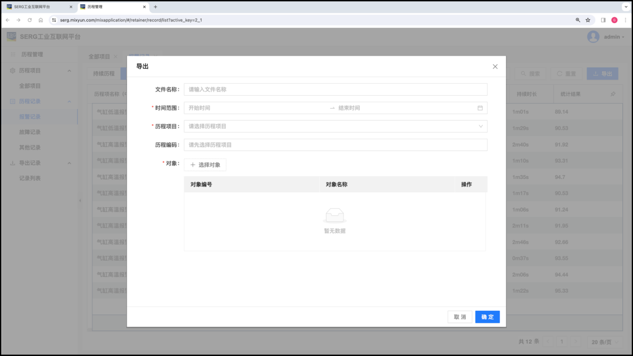 点击右上角的 “导出”,我们可以选择某个历程项目、历程项目中的某个或某些历程项编码、某些对象以及某个时间段的历程数据结果,保存到指定的文件名。