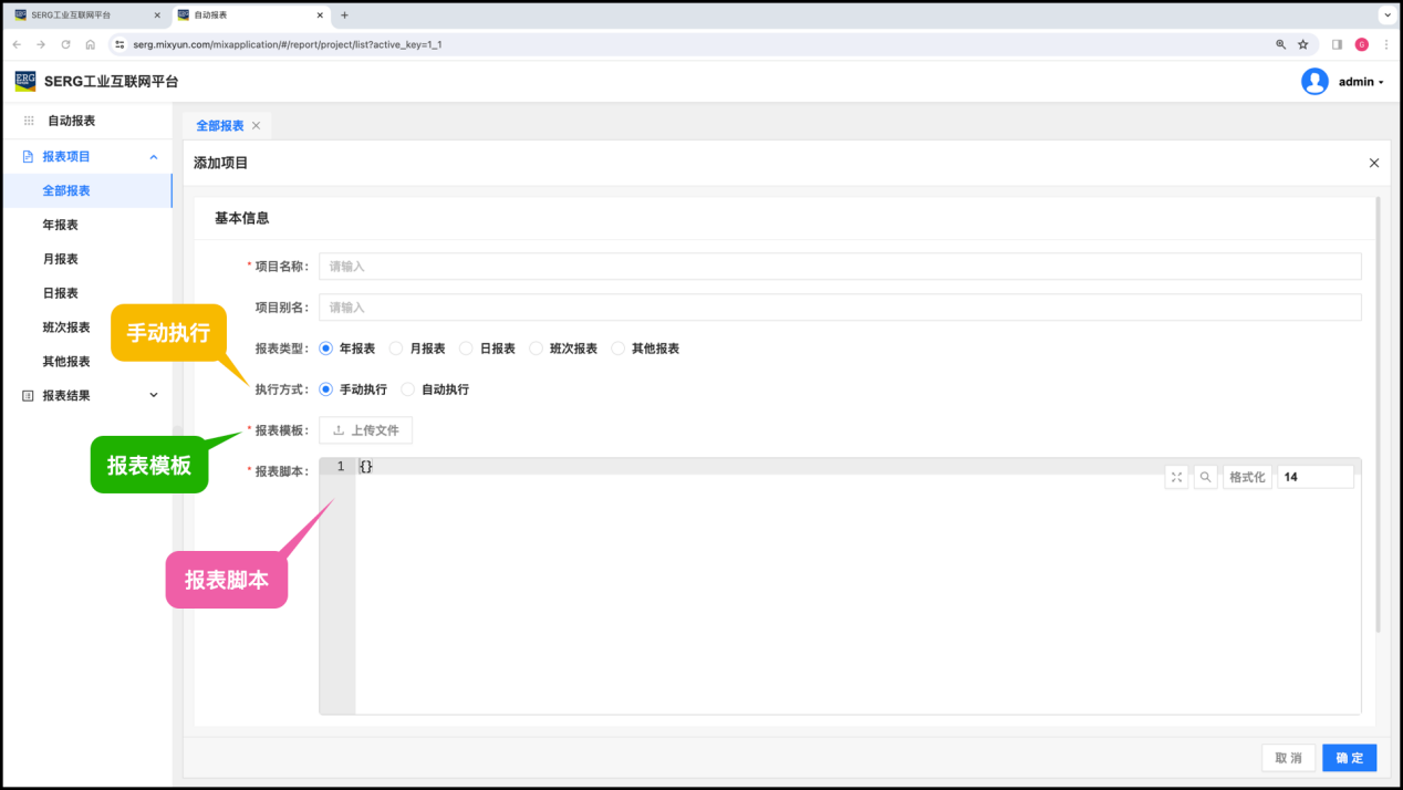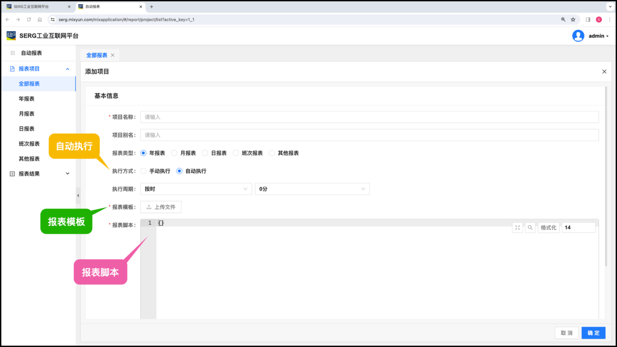 报表项目里面,有多个不同的视图:年报表、月报表、日报表、班次报表和其他报表,这是报表的分类标签,在创建报表项目的时候需要指定,这样未来就容易去查找。